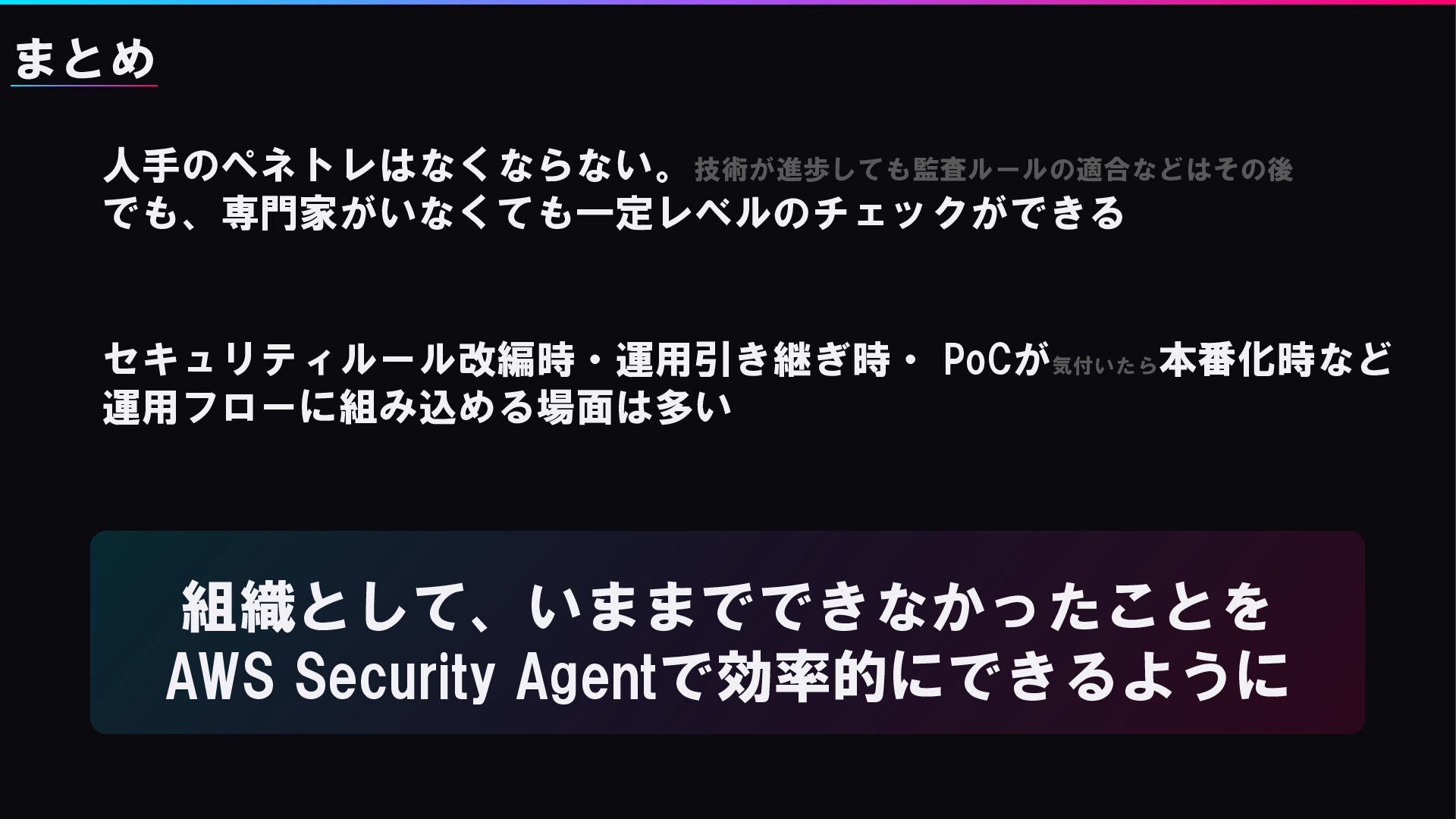 人手のペネトレはなくならない。技術が進歩しても監査ルールの適合などはその後 でも、専門家がいなくても一定レベルのチェックができる セキュリティルール改編時・運用引き継ぎ時・ PoCが気付いたら 本番化時など 運用フローに組み込める場面は多い 組織として、いままでできなかったことを AWS Security Agentで効率的にできるように