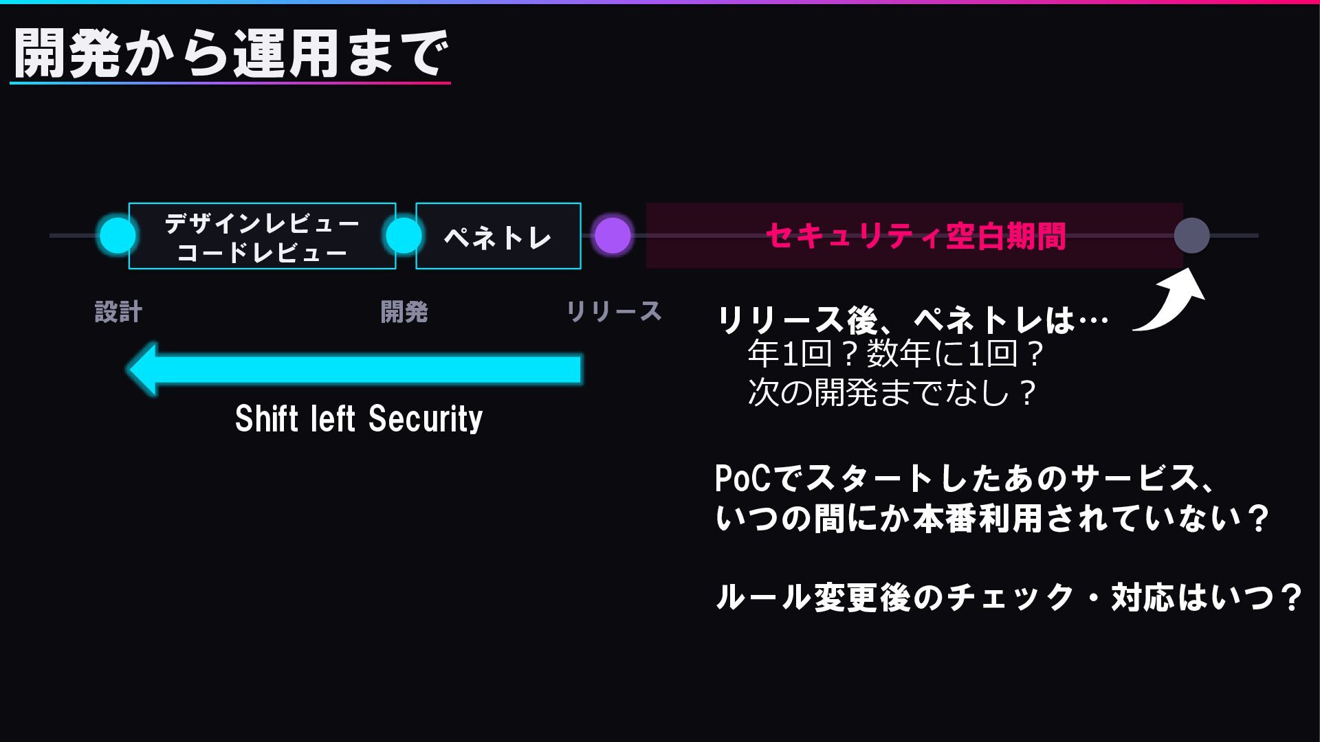 次の開発までなし? PoCでスタートしたあのサービス、 いつの間にか本番利用されていない? ルール変更後のチェック・対応はいつ? Shift left Security