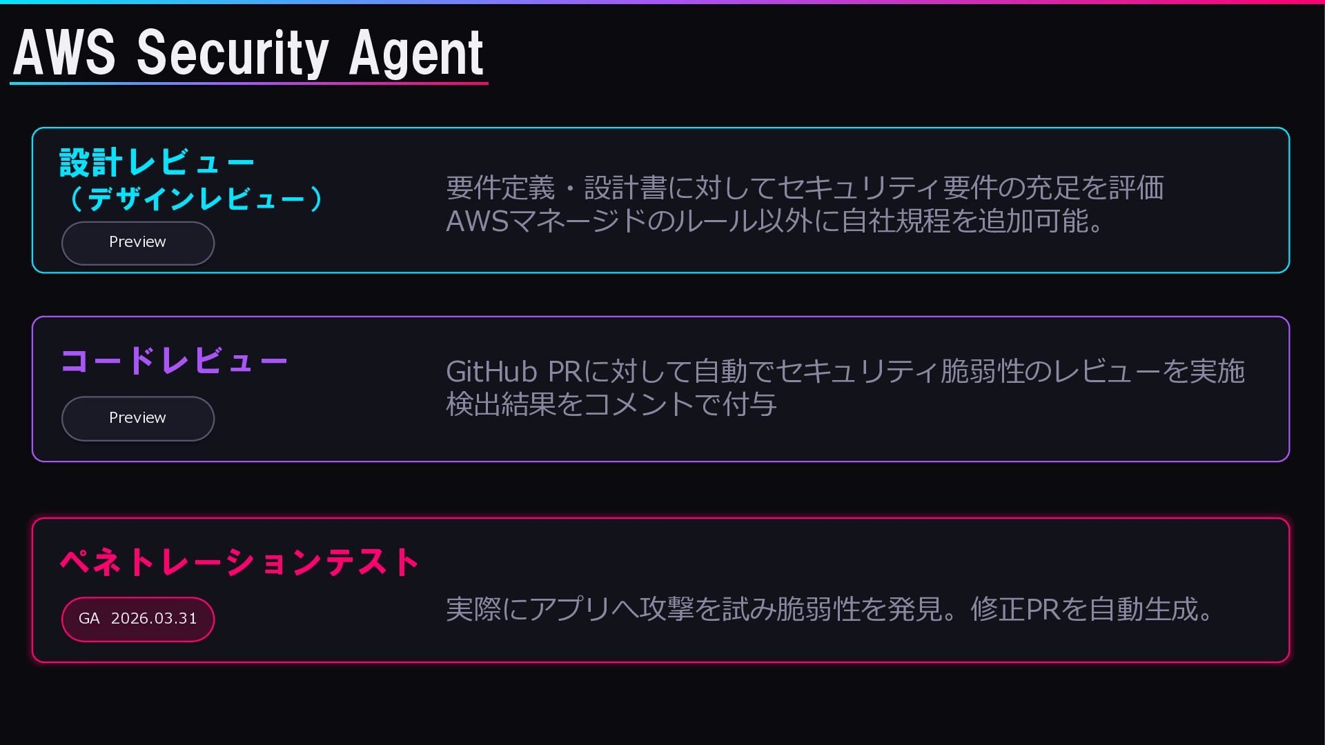 ペネトレーションテスト GA 2026.03.31 実際にアプリへ攻撃を試み脆弱性を発見。修正PRを自動生成。 AWS Security Agent