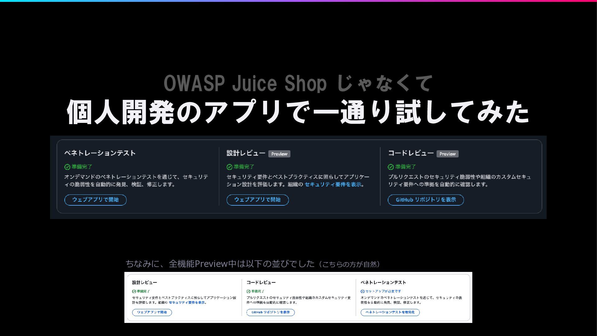 OWASP Juice Shop じゃなくて 個人開発のアプリで一通り試してみた ちなみに、全機能Preview中は以下の並びでした(こちらの方が自然)