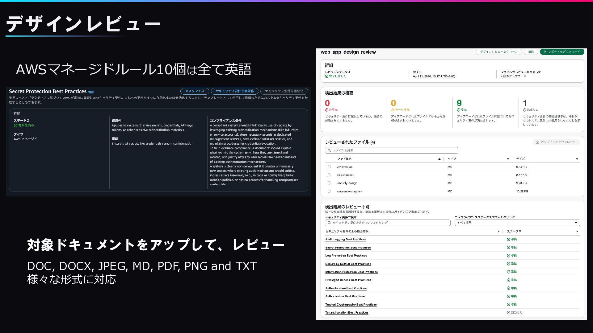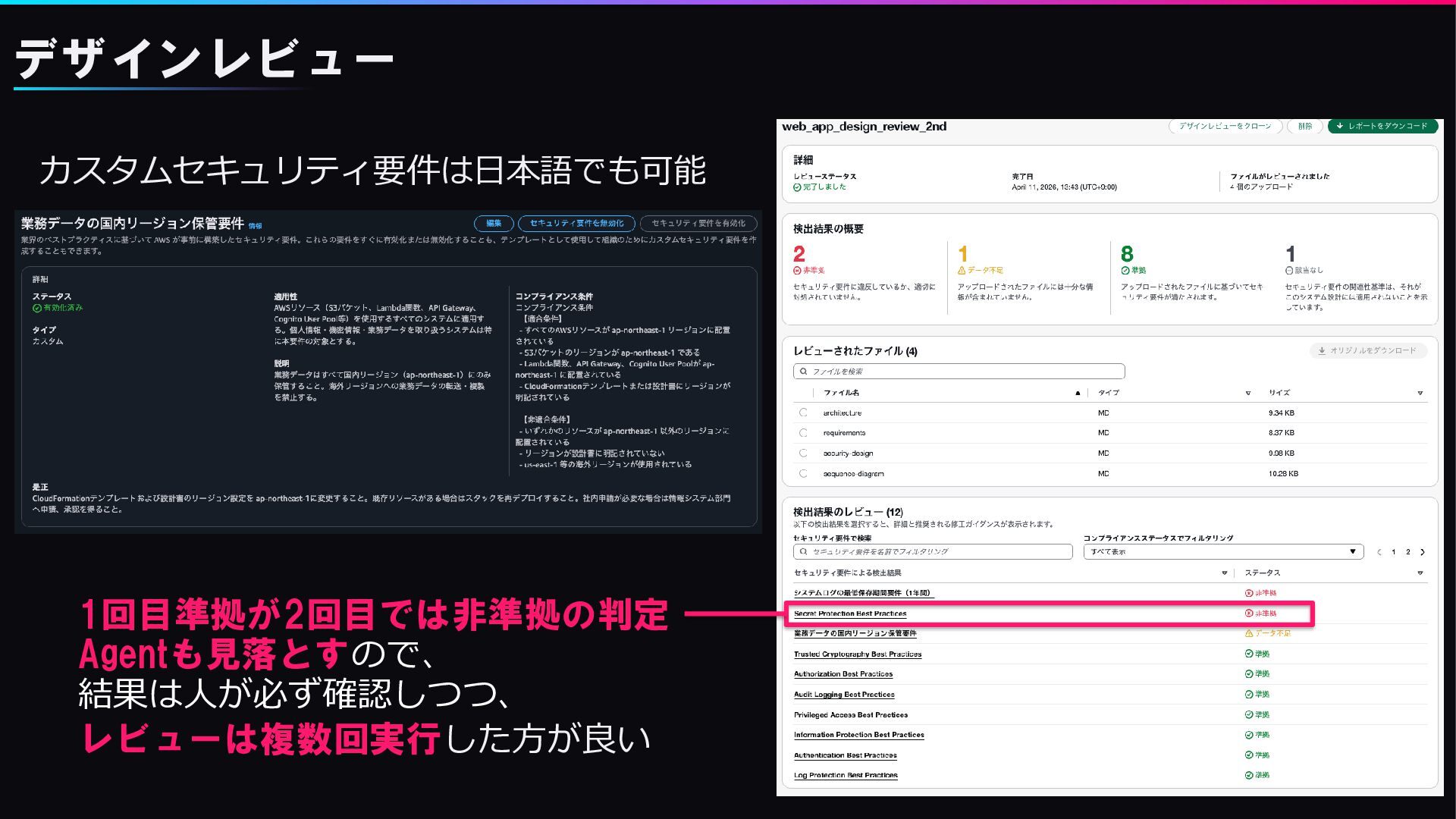カスタムルール(日本語 OK ) デザインレビュー カスタムセキュリティ要件は日本語でも可能 1回目準拠が2回目では非準拠の判定 Agentも見落とすので、 結果は人が必ず確認しつつ、 レビューは複数回実行した方が良い