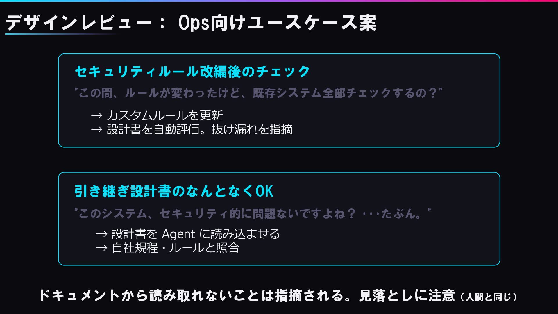 ・・・たぶん。" → 設計書を Agent に読み込ませる → 自社規程・ルールと照合 ドキュメントから読み取れないことは指摘される。見落としに注意(人間と同じ)