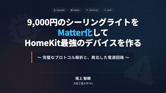 9,000円のシーリングライトを 9,000円のシーリングライトを して して HomeKit最強のデバイスを作る HomeKit最強のデバイスを作る 坂上 智朗 大阪工業大学 M1 Matter化 Matter化 〜 完璧なプロトコル解析と、敗北した電源回路 〜