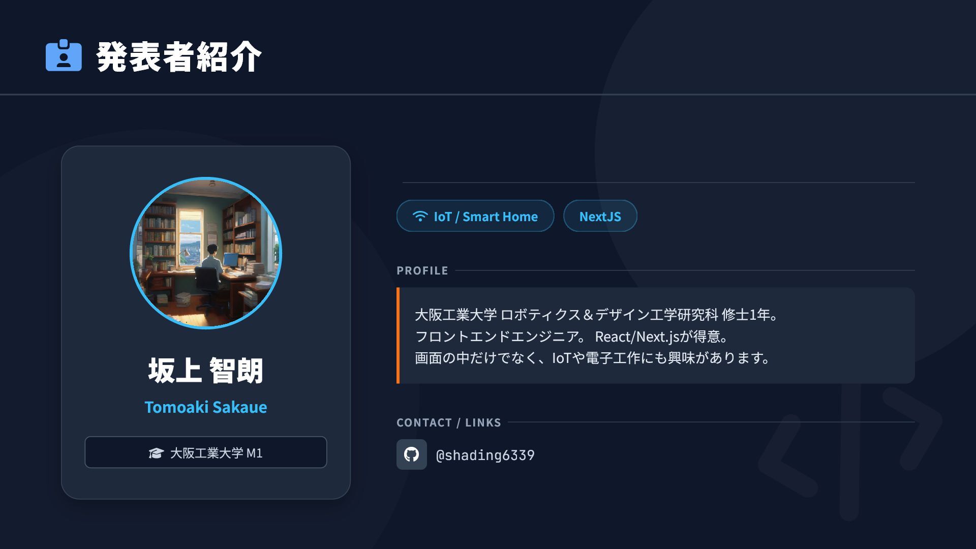 IoT / Smart Home NextJS PROFILE 大阪工業大学 ロボティクス&デザイン工学研究科 修士1年。 フロントエンドエンジニア。 React/Next.jsが得意。 画面の中だけでなく、IoTや電子工作にも興味があります。 CONTACT / LINKS @shading6339