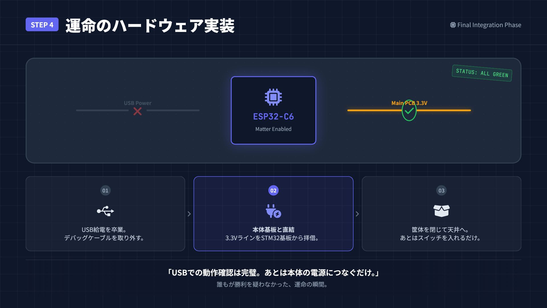 STEP 4 運命のハードウェア実装 Final Integration Phase 「USBでの動作確認は完璧。あとは本体の電源につなぐだけ。 」 誰もが勝利を疑わなかった、運命の瞬間。