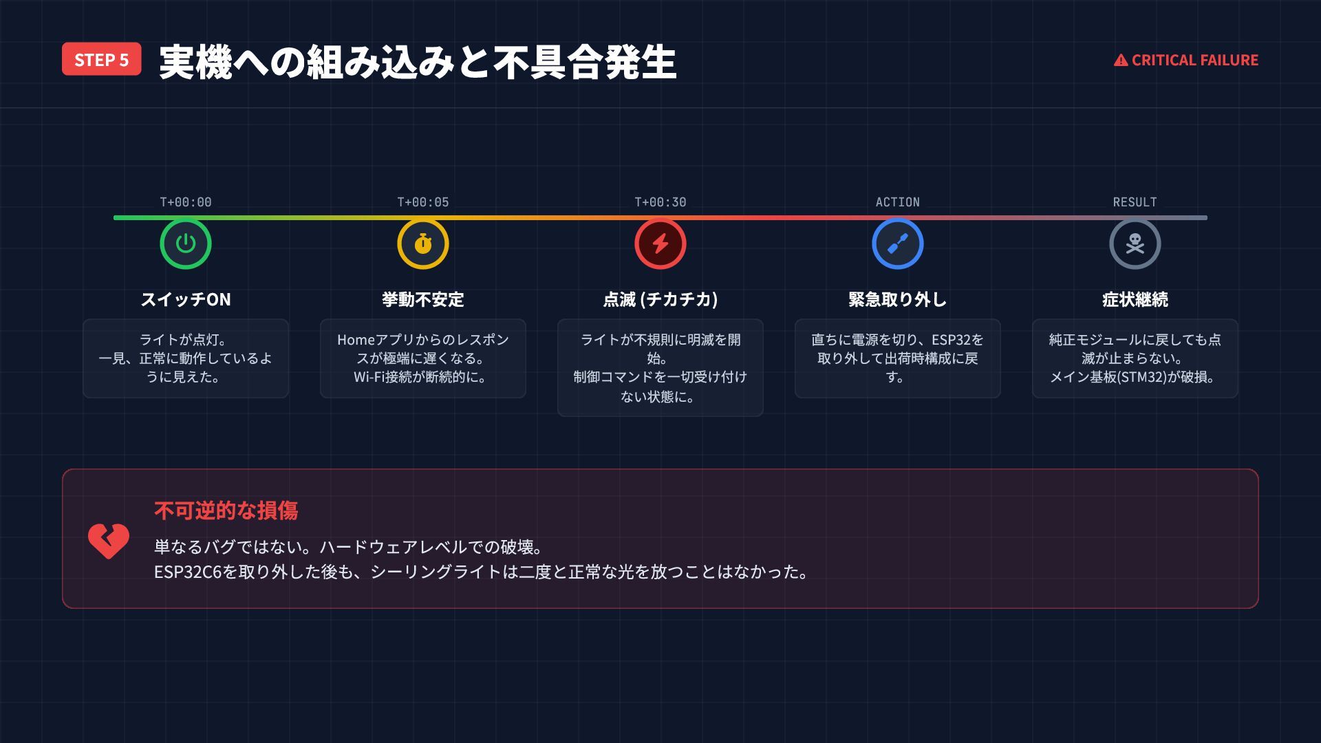 STEP 5 実機への組み込みと不具合発生 CRITICAL FAILURE 不可逆的な損傷 単なるバグではない。ハードウェアレベルでの破壊。 ESP32C6を取り外した後も、シーリングライトは二度と正常な光を放つことはなかった。