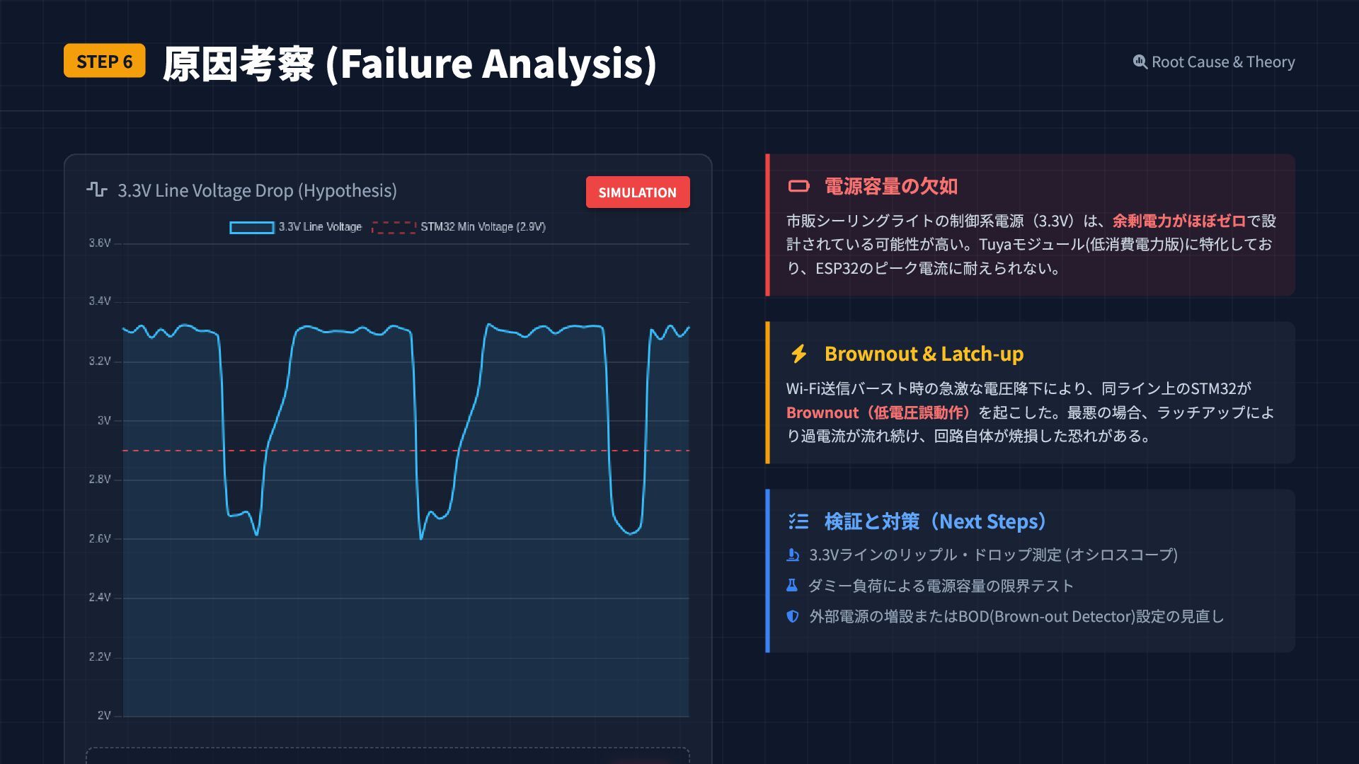 電源容量の欠如 市販シーリングライトの制御系電源(3.3V)は、余剰電力がほぼゼロで設 計されている可能性が高い。Tuyaモジュール(低消費電力版)に特化してお り、ESP32のピーク電流に耐えられない。 Brownout & Latch-up Wi-Fi送信バースト時の急激な電圧降下により、同ライン上のSTM32が Brownout(低電圧誤動作)を起こした。最悪の場合、ラッチアップによ り過電流が流れ続け、回路自体が焼損した恐れがある。 検証と対策(Next Steps) 3.3Vラインのリップル・ドロップ測定 (オシロスコープ) ダミー負荷による電源容量の限界テスト 外部電源の増設またはBOD(Brown-out Detector)設定の見直し 3.3V Line Voltage Drop (Hypothesis) SIMULATION