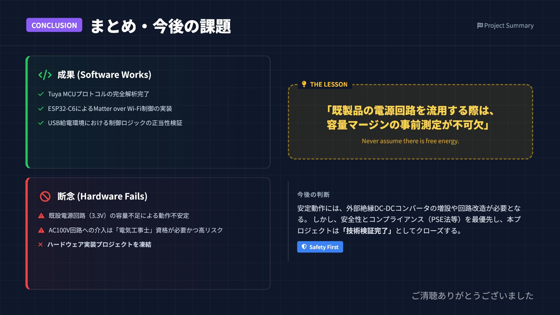 Tuya MCUプロトコルの完全解析完了 ESP32-C6によるMatter over Wi-Fi制御の実装 USB給電環境における制御ロジックの正当性検証 断念 (Hardware Fails) 既設電源回路(3.3V)の容量不足による動作不安定 AC100V回路への介入は「電気工事士」資格が必要かつ高リスク ハードウェア実装プロジェクトを凍結 今後の判断 安定動作には、外部絶縁DC-DCコンバータの増設や回路改造が必要とな る。 しかし、安全性とコンプライアンス(PSE法等)を最優先し、本プ ロジェクトは「技術検証完了」としてクローズする。 Safety First 「既製品の電源回路を流用する際は、 容量マージンの事前測定が不可欠」 THE LESSON Never assume there is free energy.