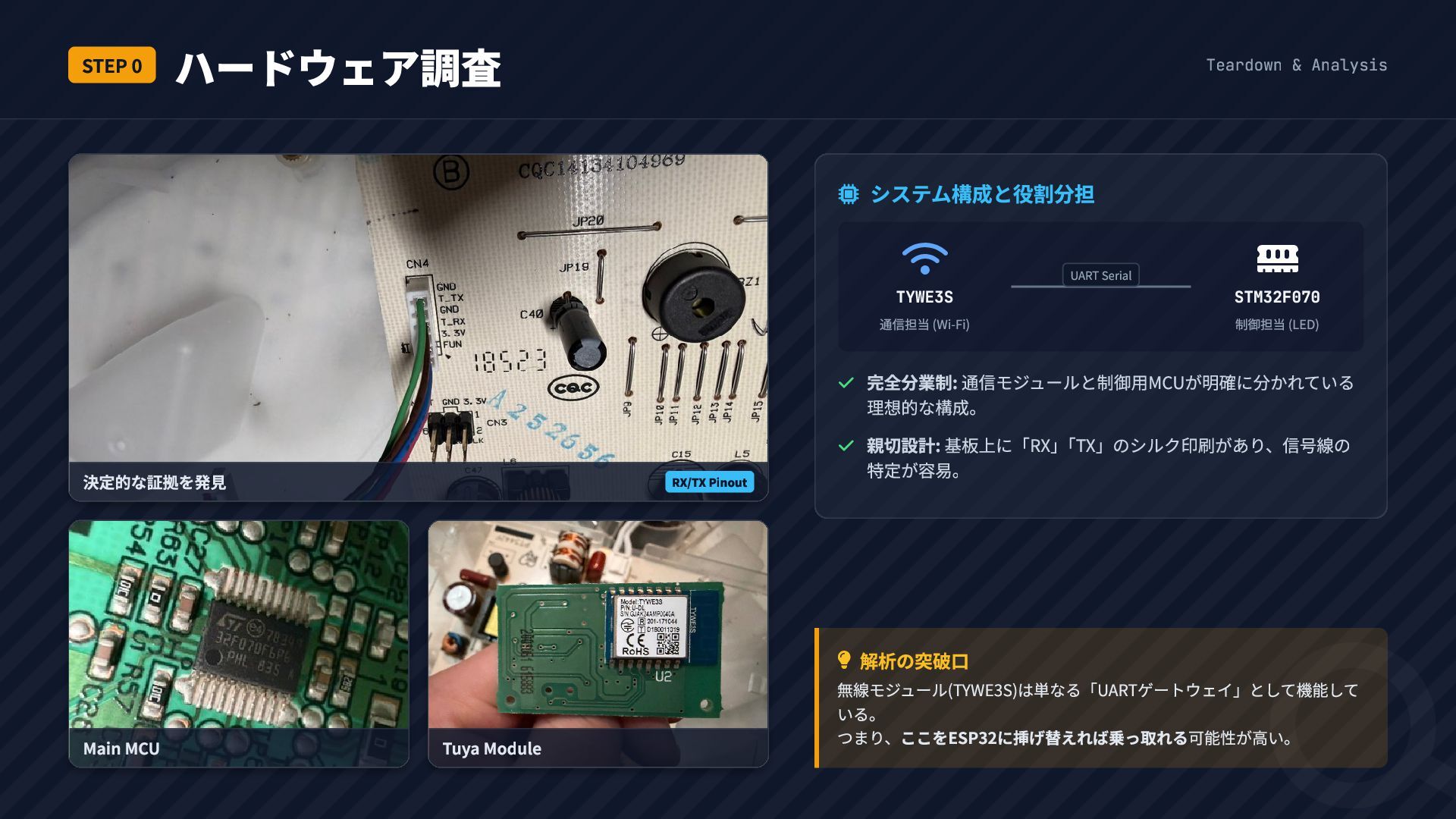 STEP 0 ハードウェア調査 Teardown & Analysis 解析の突破口 無線モジュール(TYWE3S)は単なる「UARTゲートウェイ」として機能して いる。