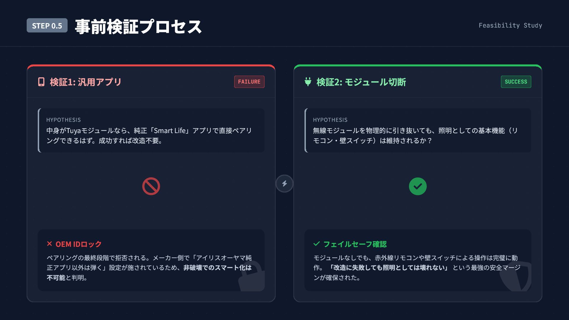 中身がTuyaモジュールなら、純正「Smart Life」アプリで直接ペアリ ングできるはず。成功すれば改造不要。 検証2: モジュール切断 SUCCESS HYPOTHESIS 無線モジュールを物理的に引き抜いても、照明としての基本機能(リ モコン・壁スイッチ)は維持されるか? OEM IDロック ペアリングの最終段階で拒否される。メーカー側で「アイリスオーヤマ純 正アプリ以外は弾く」設定が施されているため、非破壊でのスマート化は 不可能と判明。 フェイルセーフ確認 モジュールなしでも、赤外線リモコンや壁スイッチによる操作は完璧に動 作。 「改造に失敗しても照明としては壊れない」 という最強の安全マージ ンが確保された。