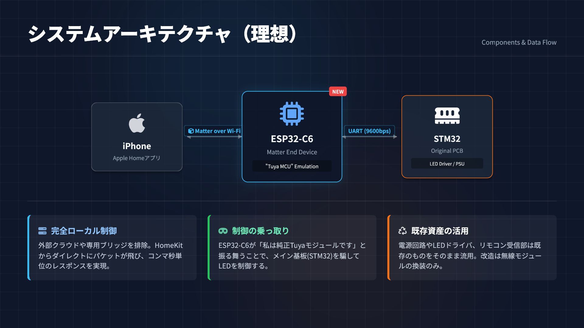 ESP32-C6が「私は純正Tuyaモジュールです」と 振る舞うことで、メイン基板(STM32)を騙して LEDを制御する。 既存資産の活用 電源回路やLEDドライバ、リモコン受信部は既 存のものをそのまま流用。改造は無線モジュー ルの換装のみ。 iPhone Apple Homeアプリ Matter over Wi-Fi UART (9600bps) STM32 Original PCB LED Driver / PSU ESP32-C6 Matter End Device "Tuya MCU" Emulation NEW