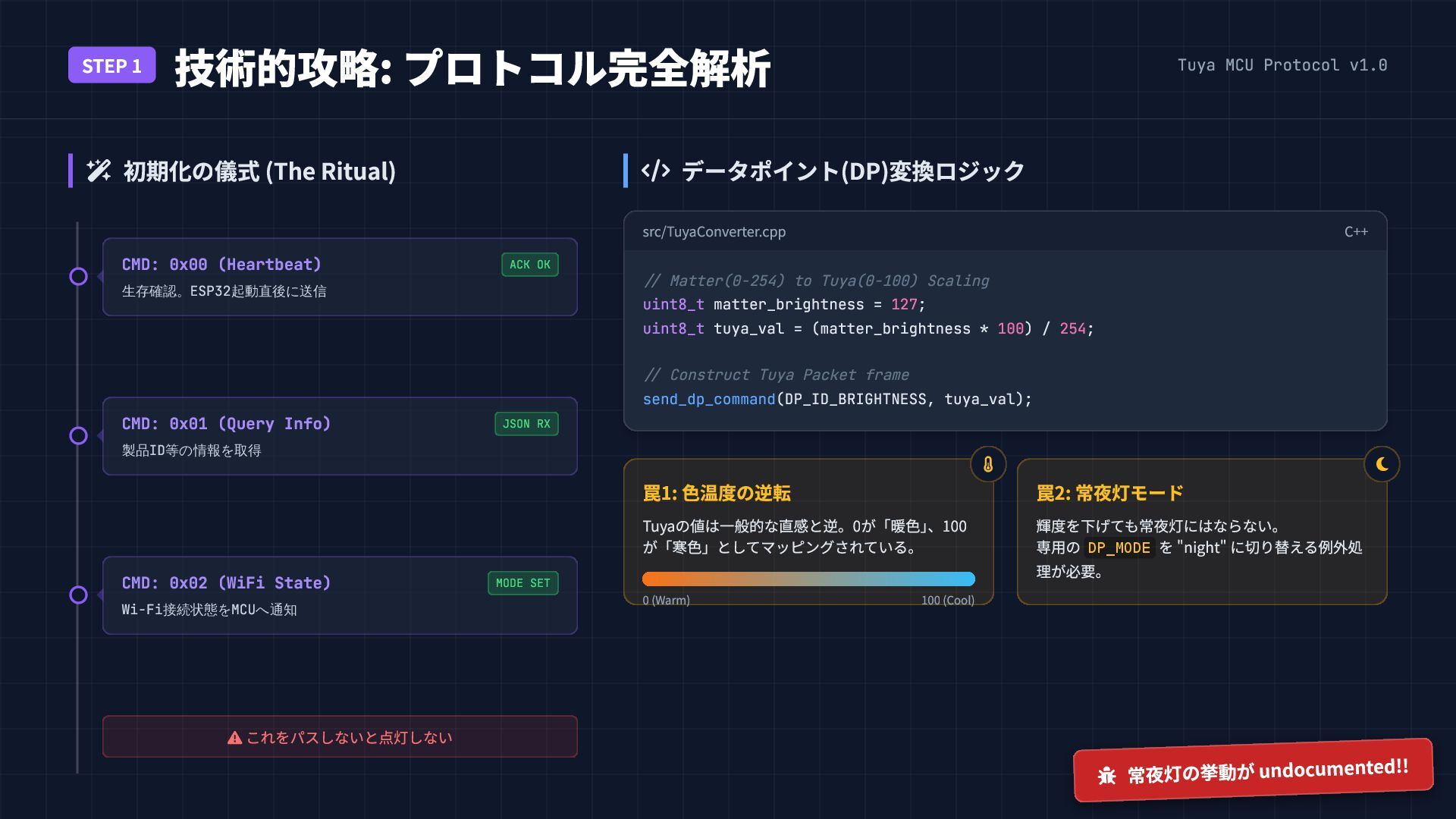 (The Ritual) データポイント(DP)変換ロジック src/TuyaConverter.cpp C++ // Matter(0-254) to Tuya(0-100) Scaling uint8_t matter_brightness = 127; uint8_t tuya_val = (matter_brightness * 100) / 254; // Construct Tuya Packet frame send_dp_command(DP_ID_BRIGHTNESS, tuya_val); これをパスしないと点灯しない CMD: 0x00 (Heartbeat) ACK OK 生存確認。ESP32起動直後に送信 CMD: 0x01 (Query Info) JSON RX 製品ID等の情報を取得 CMD: 0x02 (WiFi State) MODE SET Wi-Fi接続状態をMCUへ通知 罠1: 色温度の逆転 Tuyaの値は一般的な直感と逆。0が「暖色」 、100 が「寒色」としてマッピングされている。 0 (Warm) 100 (Cool) 罠2: 常夜灯モード 輝度を下げても常夜灯にはならない。 専用の DP_MODE を "night" に切り替える例外処 理が必要。 常夜灯の挙動が undocumented!!