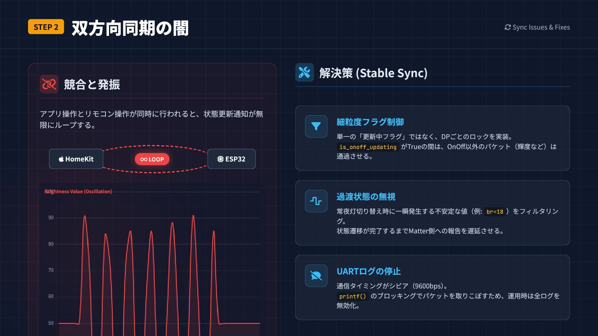 (Stable Sync) 細粒度フラグ制御 単一の「更新中フラグ」ではなく、DPごとのロックを実装。 is_onoff_updating がTrueの間は、OnOff以外のパケット(輝度など)は 通過させる。 過渡状態の無視 常夜灯切り替え時に一瞬発生する不安定な値(例: br=18 )をフィルタリン グ。 状態遷移が完了するまでMatter側への報告を遅延させる。 UARTログの停止 通信タイミングがシビア(9600bps) 。 printf() のブロッキングでパケットを取りこぼすため、運用時は全ログを 無効化。 競合と発振 アプリ操作とリモコン操作が同時に行われると、状態更新通知が無 限にループする。 Brightness Value (Oscillation) LOOP HomeKit ESP32