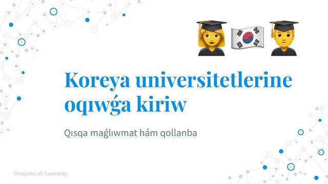 kóplew ◎ Universitet izlew jolları: a. https://www.studyinkorea.go.kr saytınan universitetlerdi tabamız ◉ Universitet saytı ➡ Fakultet saytı ➡ Laboratoriya saytı ➡ Professor b. Google (qızıqqan tarawıńız + “lab” + “site:.ac.kr”) ◎ Tapsırıwdan aldın professor menen birinshi baylanısıń ⚠ 14