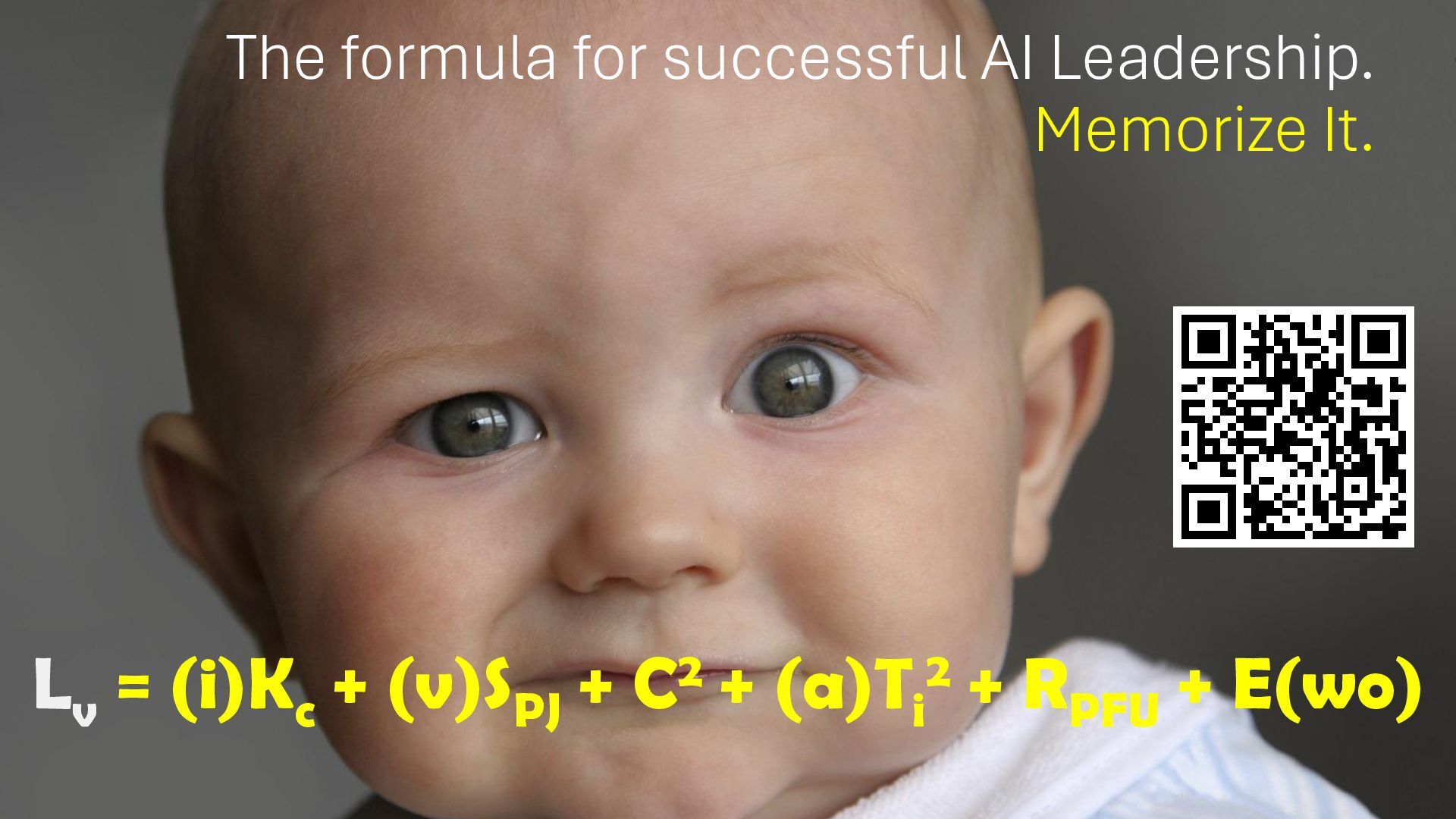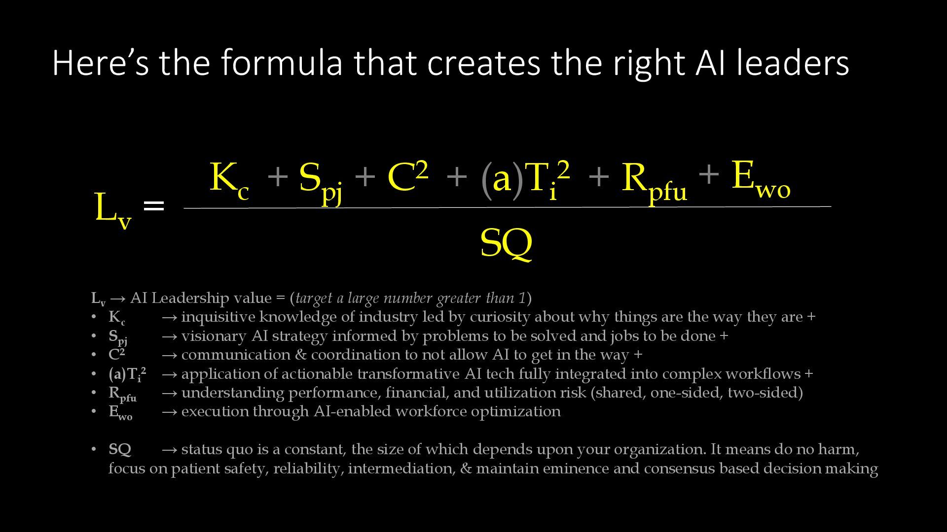 The presentation introduces a leadership formula `Lv = (i)Kc + (v)SPJ + C² + (a)Ti² + RPFU + E(wo)` that quantifies how curiosity, strategic judgment, coordination, applied technology, risk fluency, and workforce optimization drive effective AI leadership in healthcare. Shah traces the historical arc from digitizing physics to digitizing biology, showing how medicine is becoming an auditable, data-rich science where judgment itself becomes measurable.