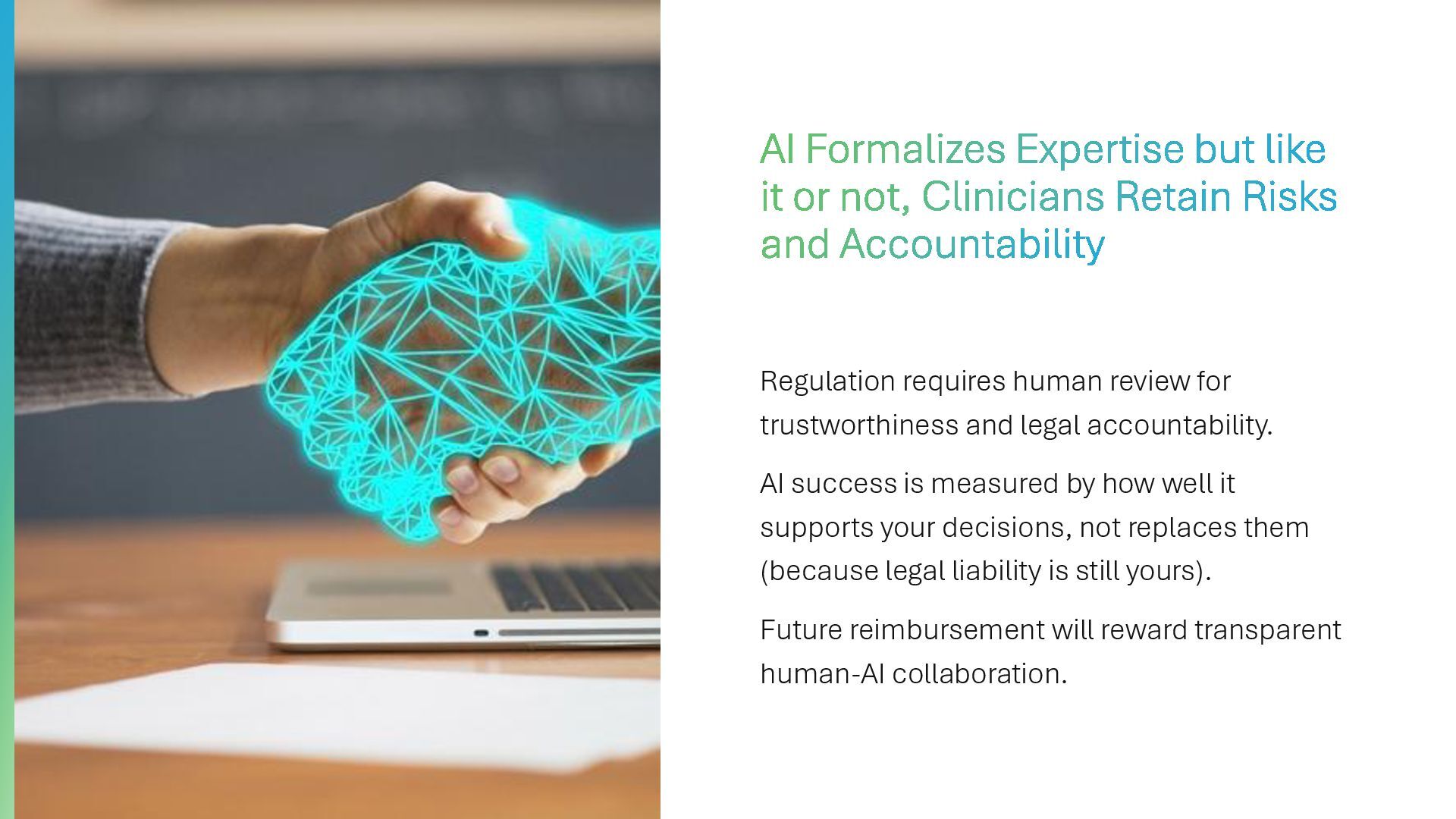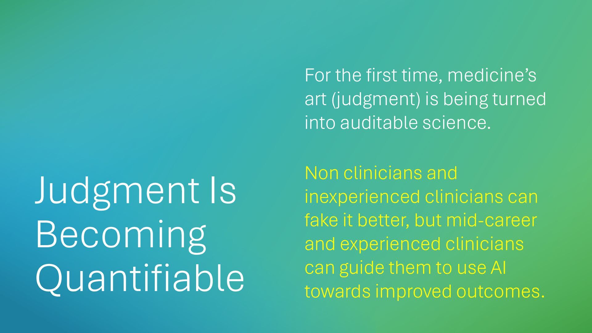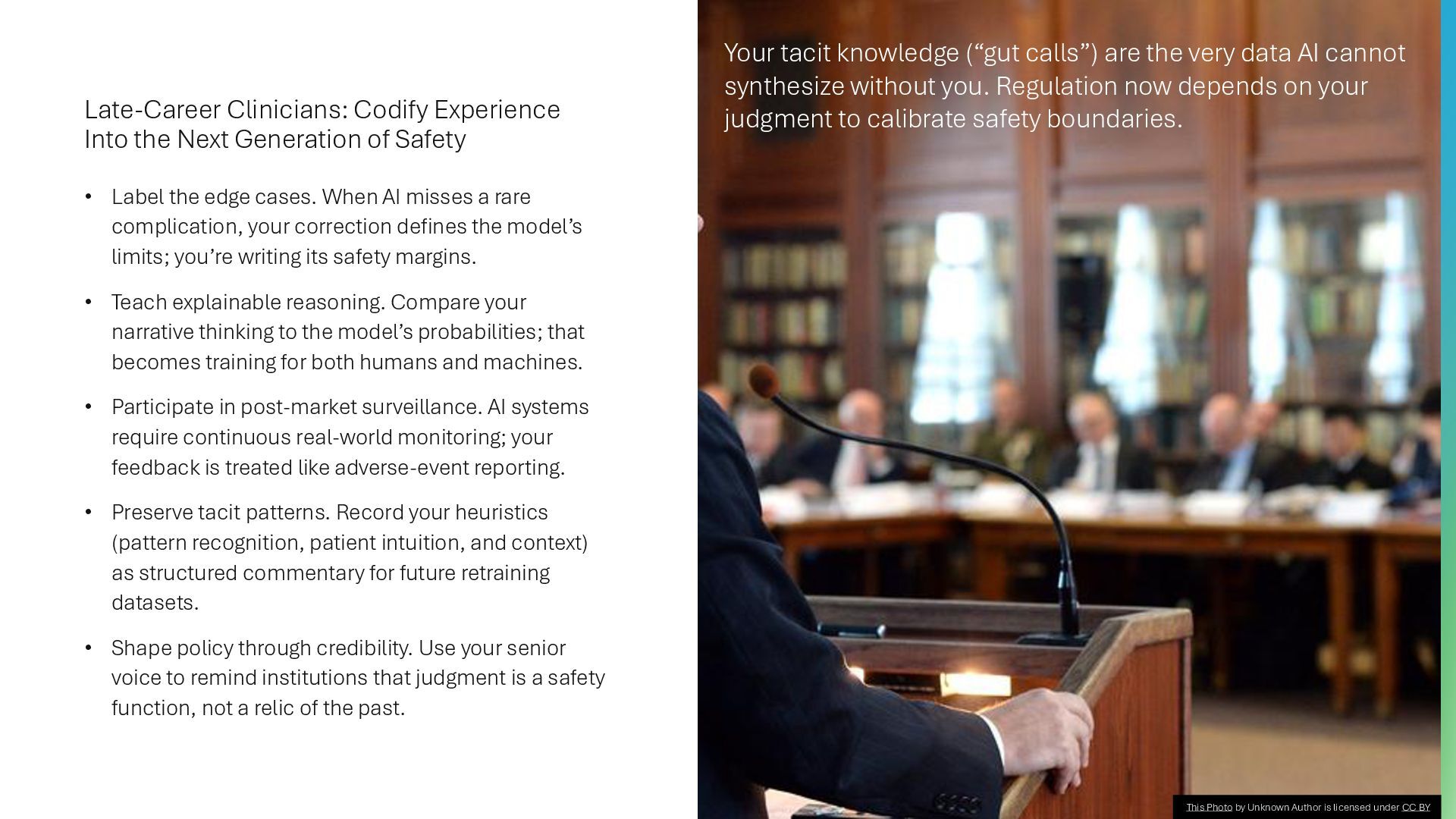 * Late-career clinicians should codify their tacit knowledge—intuition, heuristics, and pattern recognition—into structured insights that define the safety boundaries of AI systems.