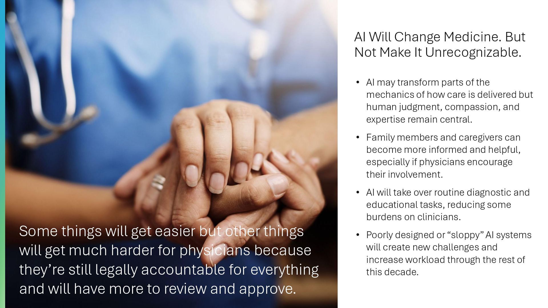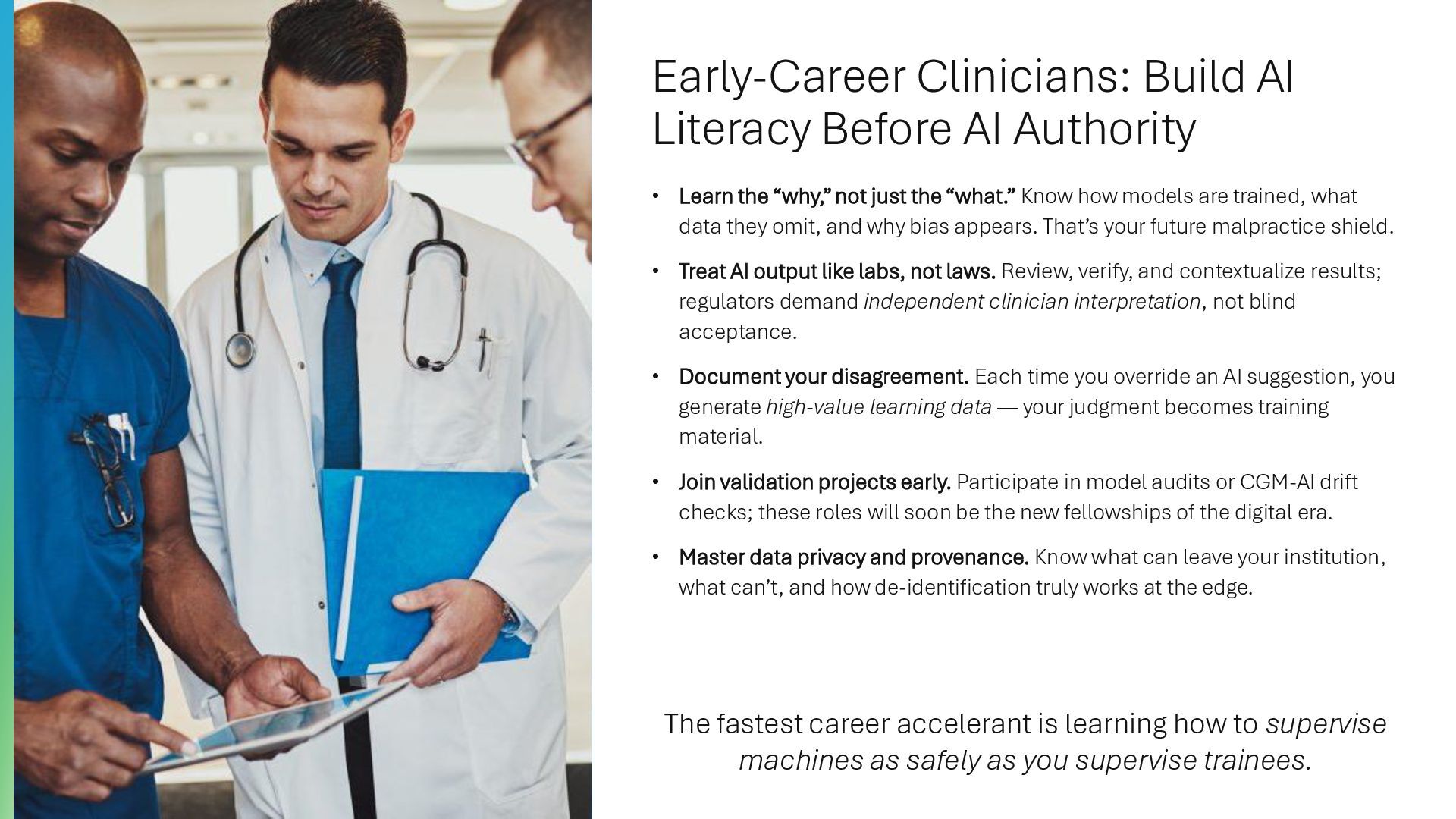 * Early-career clinicians should build AI literacy and treat model outputs like lab results—subject to review, verification, and contextualization.