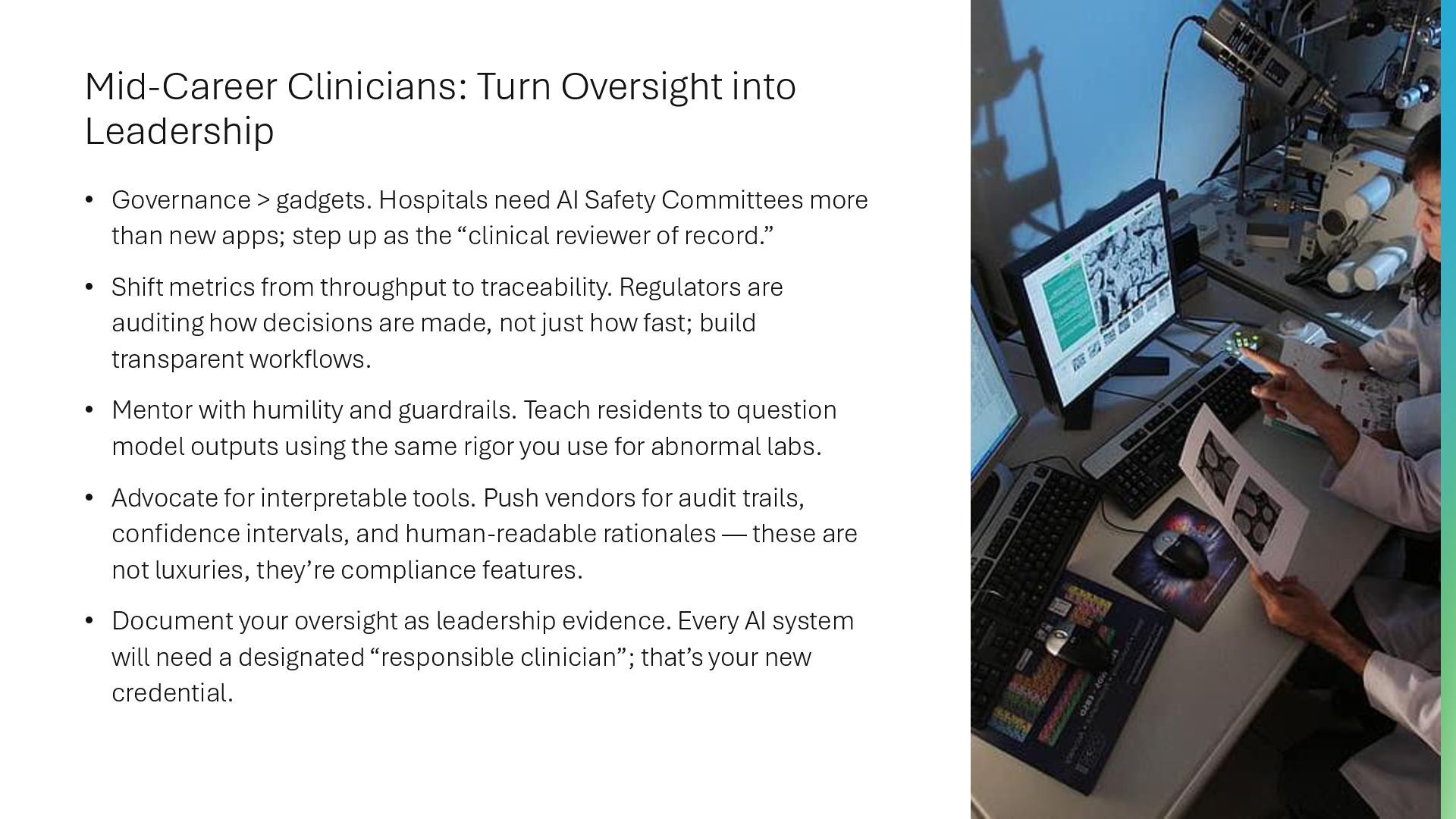 * Mid-career clinicians should transition from AI users to AI governance leaders, ensuring safety, traceability, and interpretability.