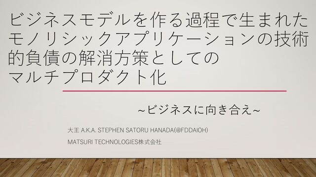 ビジネスモデルを作る過程で⽣まれた モノリシックアプリケーションの技術 的負債の解消⽅策としての マルチプロダクト化 ⼤王 A.K.A. STEPHEN SATORU HANADA(@FDDAIOH) MATSURI