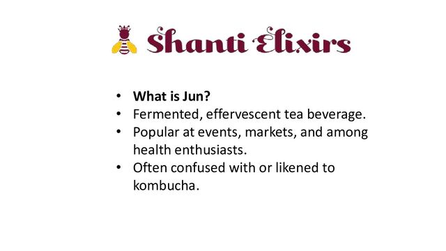 https://shantielixirs.com/ - This presentation provides an insightful overview of Jun, a fermented tea beverage, highlighting its distinct characteristics and health benefits. It covers its comparison with kombucha, addresses common questions, and explains what makes Jun unique. The presentation also emphasizes its health benefits and invites the audience to join the Jun movement, concluding with contact information for further engagement.
