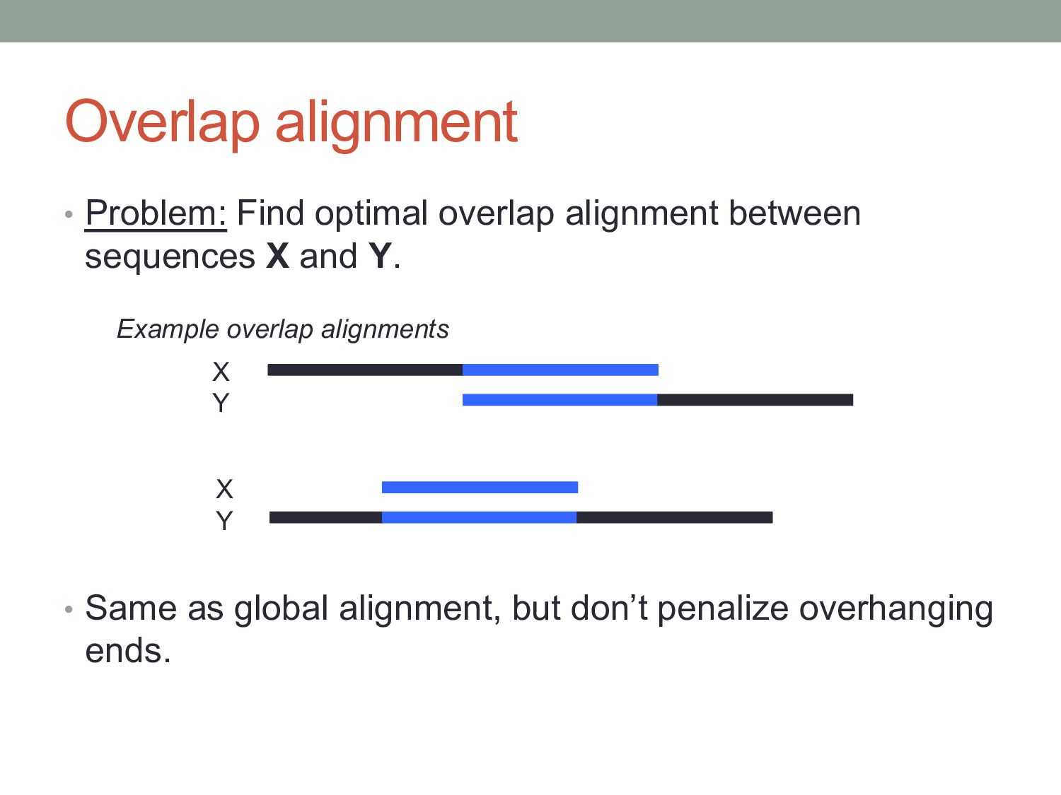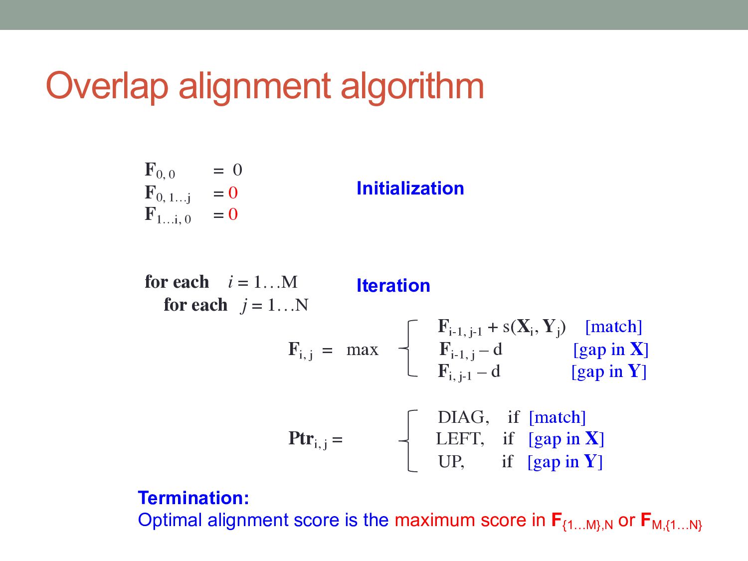 0 F1…i, 0 = 0 for each i = 1…M for each j = 1…N Fi-1, j-1 + s(Xi , Yj ) [match] Fi, j = max Fi-1, j – d [gap in X] Fi, j-1 – d [gap in Y] DIAG, if [match] Ptri, j = LEFT, if [gap in X] UP, if [gap in Y] Initialization Iteration Termination: Optimal alignment score is the maximum score in F{1…M},N or FM,{1…N}