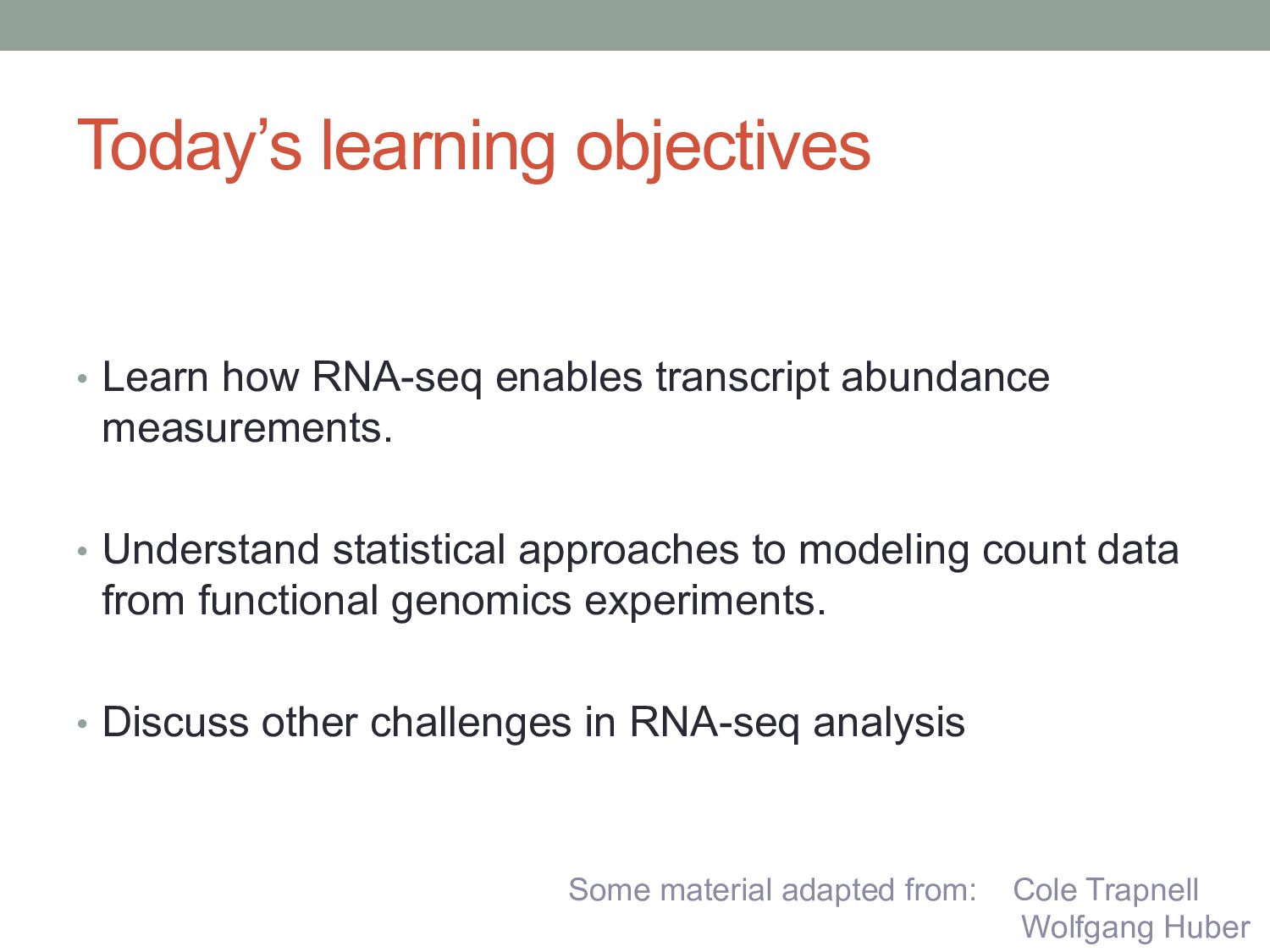 measurements. • Understand statistical approaches to modeling count data from functional genomics experiments. • Discuss other challenges in RNA-seq analysis Some material adapted from: Cole Trapnell Wolfgang Huber