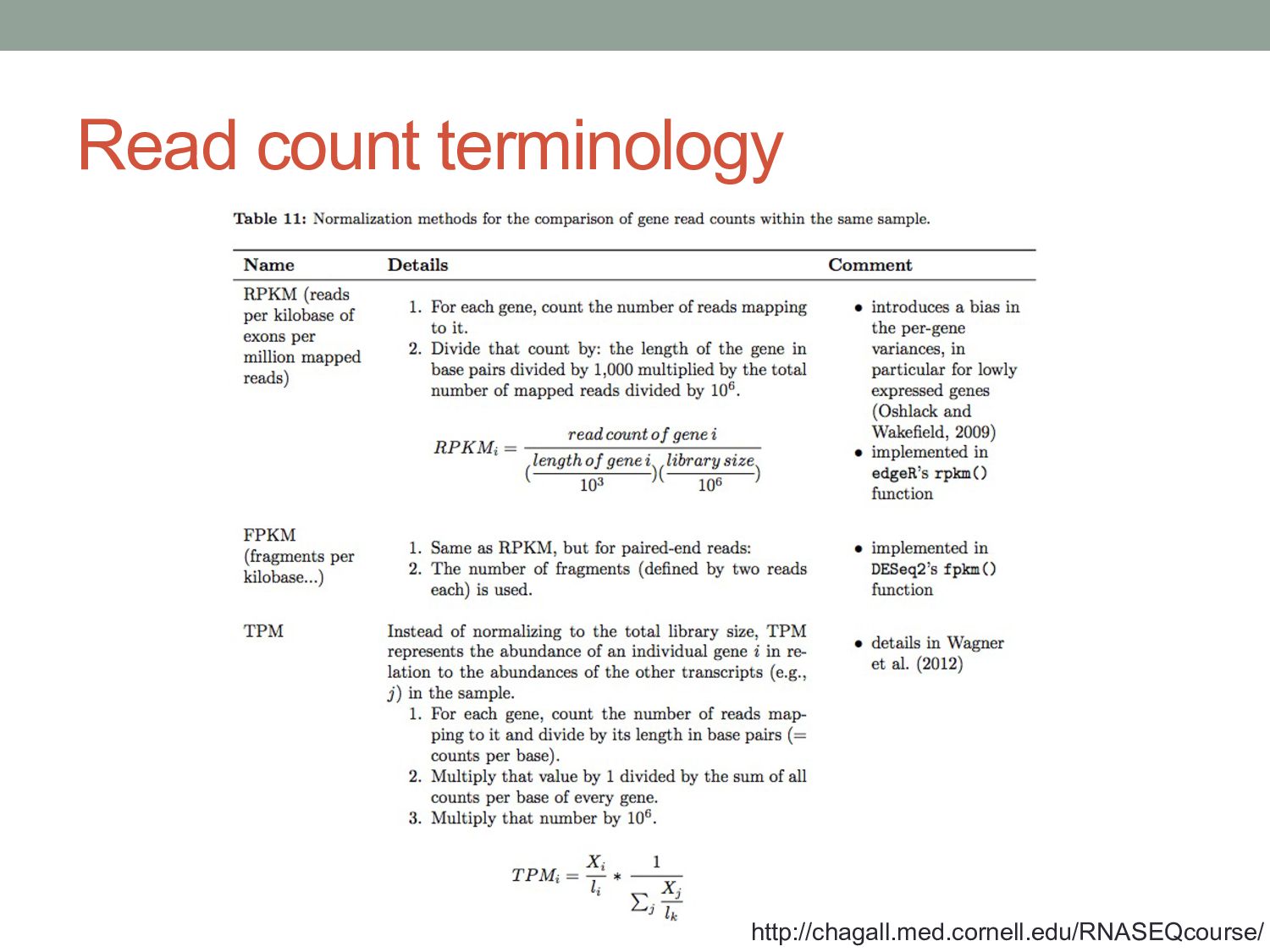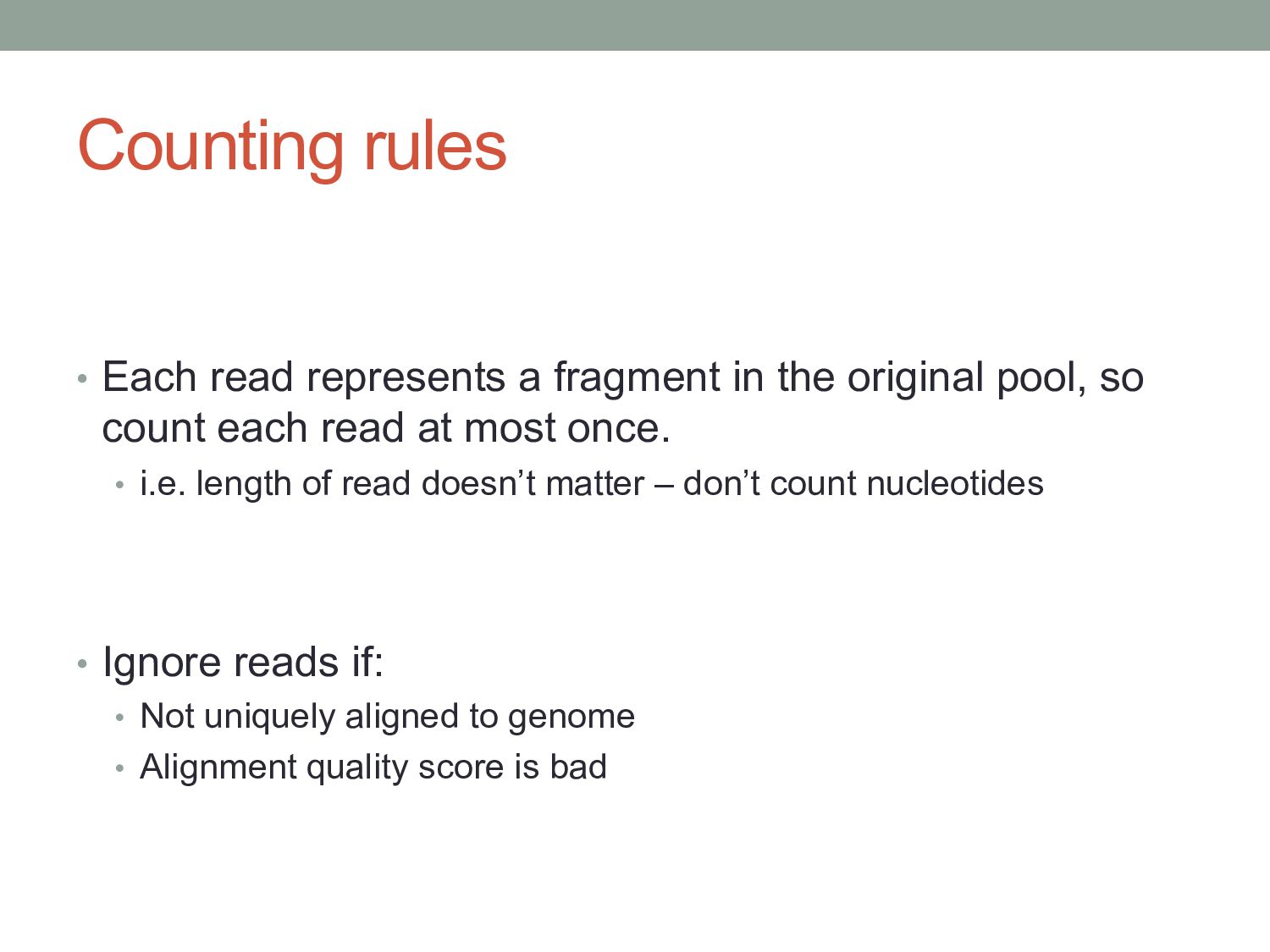 original pool, so count each read at most once. • i.e. length of read doesn’t matter – don’t count nucleotides • Ignore reads if: • Not uniquely aligned to genome • Alignment quality score is bad