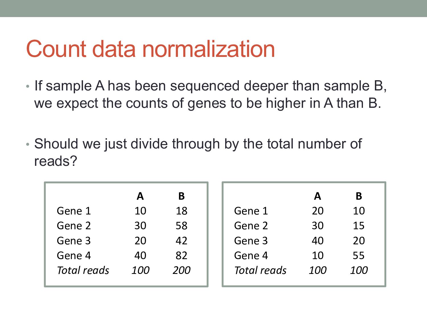 deeper than sample B, we expect the counts of genes to be higher in A than B. • Should we just divide through by the total number of reads? A B Gene 1 10 18 Gene 2 30 58 Gene 3 20 42 Gene 4 40 82 Total reads 100 200 A B Gene 1 20 10 Gene 2 30 15 Gene 3 40 20 Gene 4 10 55 Total reads 100 100