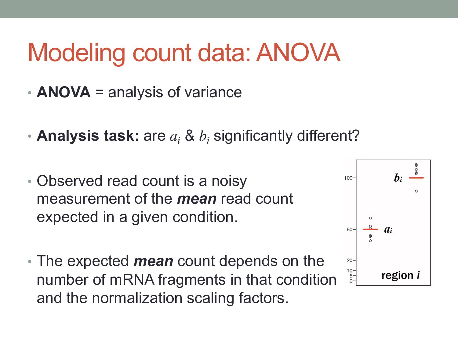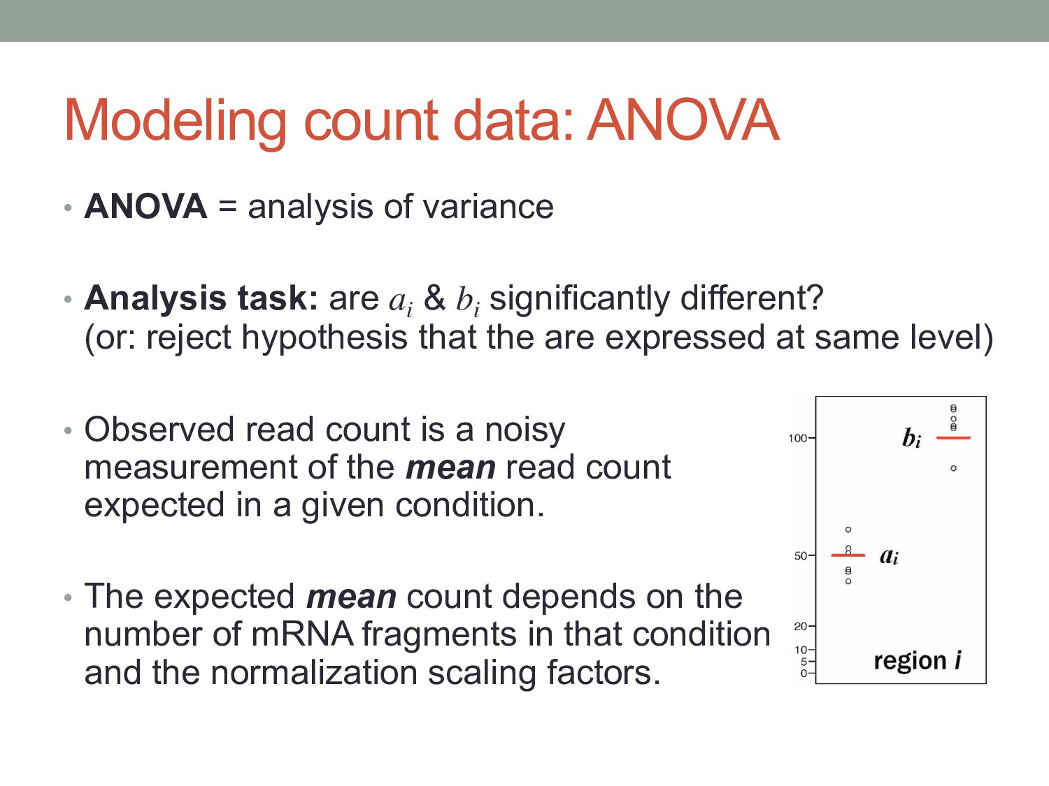 • Analysis task: are ai & bi significantly different? (or: reject hypothesis that the are expressed at same level) • Observed read count is a noisy measurement of the mean read count expected in a given condition. • The expected mean count depends on the number of mRNA fragments in that condition and the normalization scaling factors.
