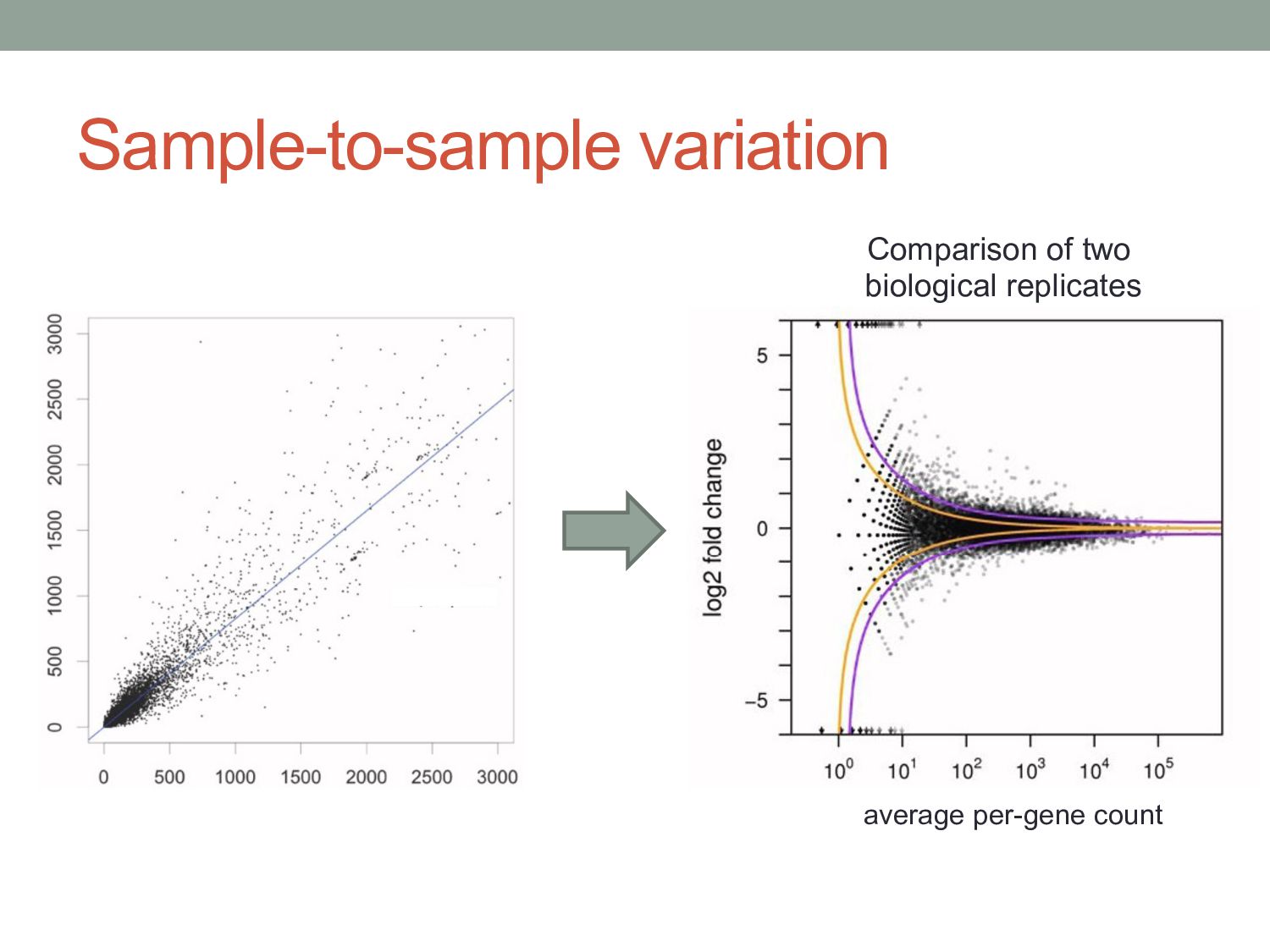 know if the count level for a given gene is significantly different between two samples? • Normalization • Different experiments have different numbers of reads • Different cells may have different levels of total RNA • Read counts are noisy estimates of RNA levels • Repeating the experiment gives different counts for each gene • Need to estimate mean & variance of the counts for each gene • Challenges • Challenge 1: Normal distribution doesn’t work very well for count data • Challenge 2: Typically few replicates for RNA-seq / ChIP-seq • Challenge 3: Variance different for low counts vs. high counts