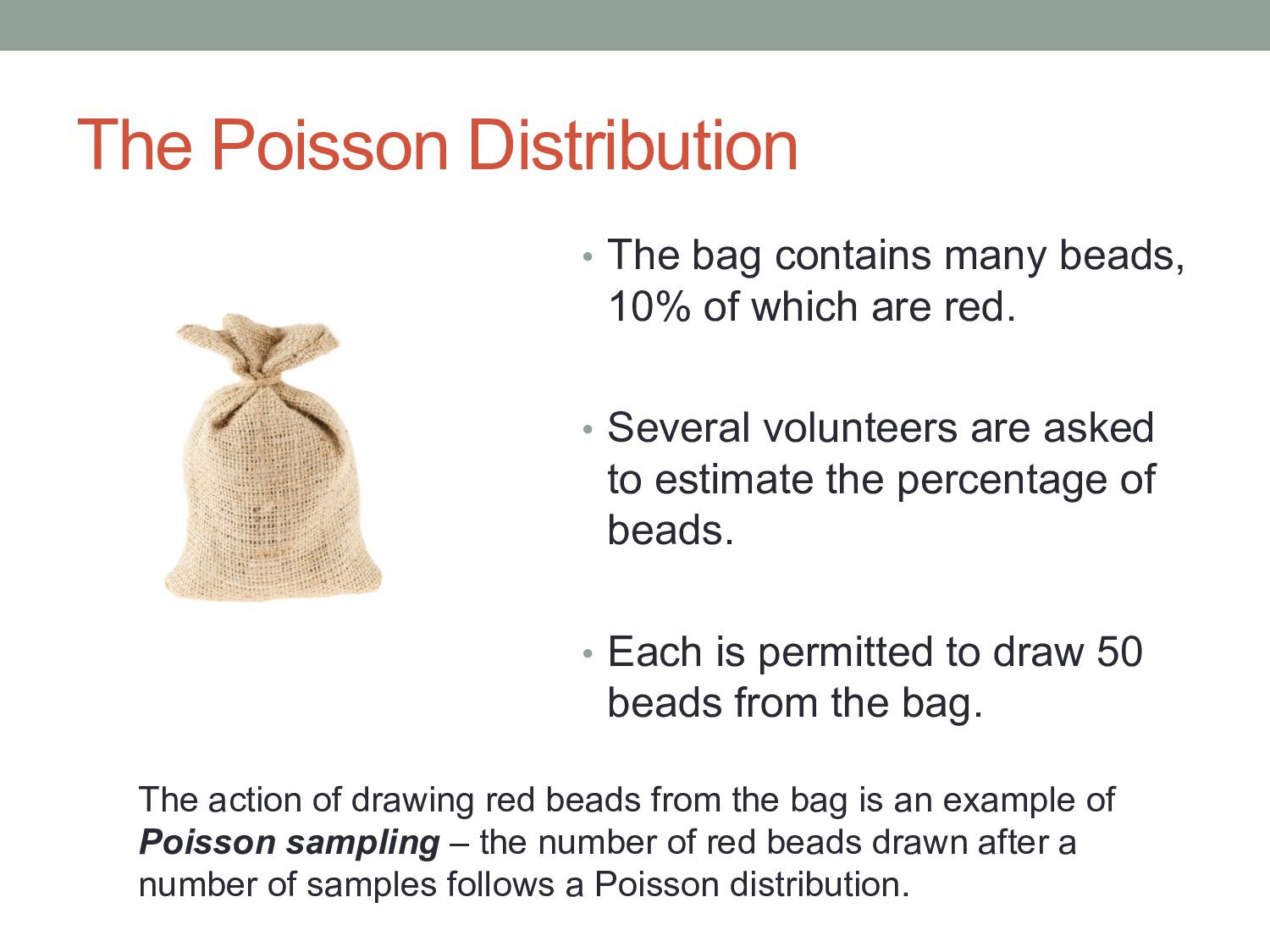 of which are red. • Several volunteers are asked to estimate the percentage of beads. • Each is permitted to draw 50 beads from the bag. The action of drawing red beads from the bag is an example of Poisson sampling – the number of red beads drawn after a number of samples follows a Poisson distribution.