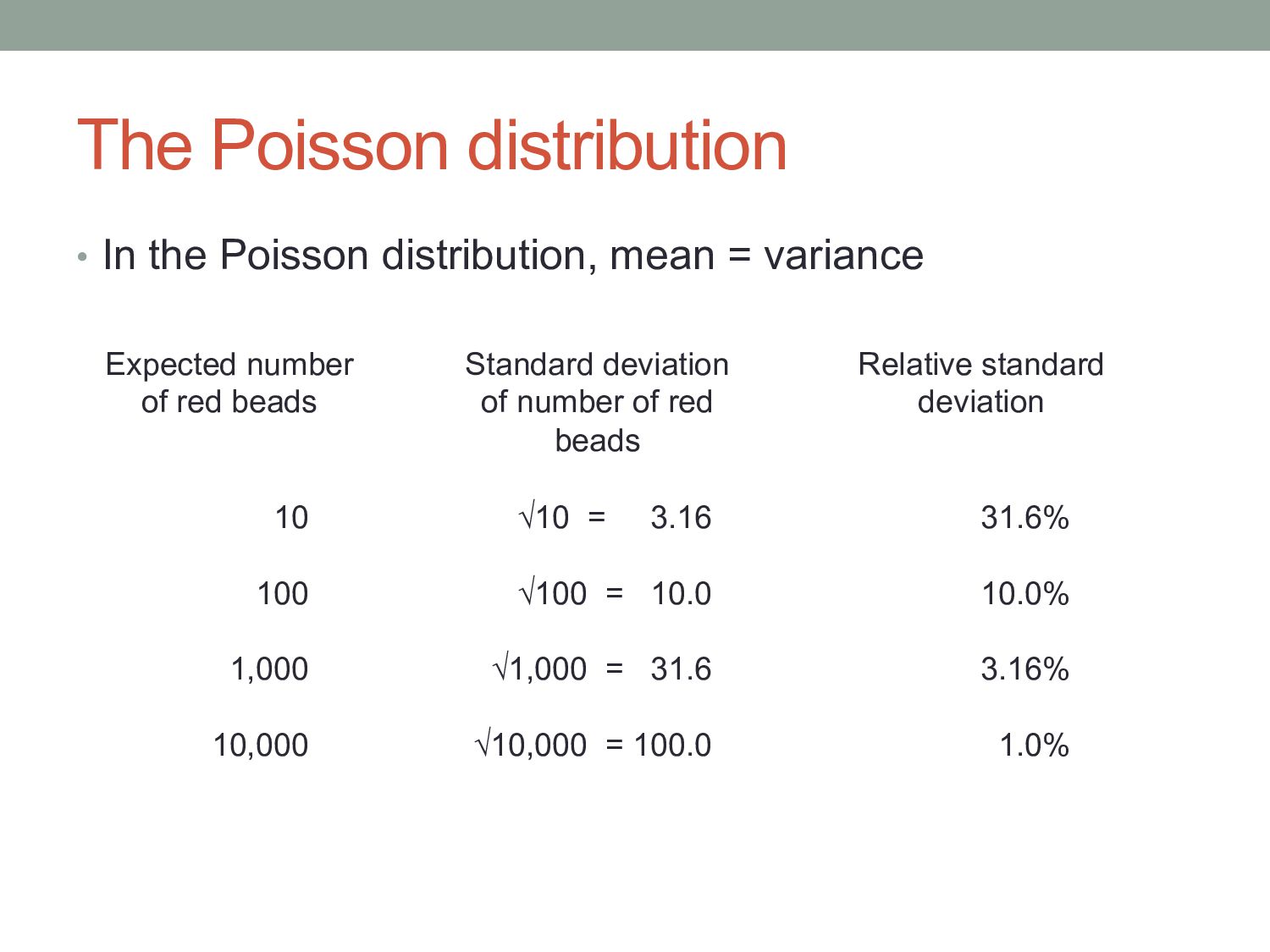 variance Expected number of red beads Standard deviation of number of red beads Relative standard deviation 10 100 1,000 10,000 √10 = 3.16 √100 = 10.0 √1,000 = 31.6 √10,000 = 100.0 31.6% 10.0% 3.16% 1.0%