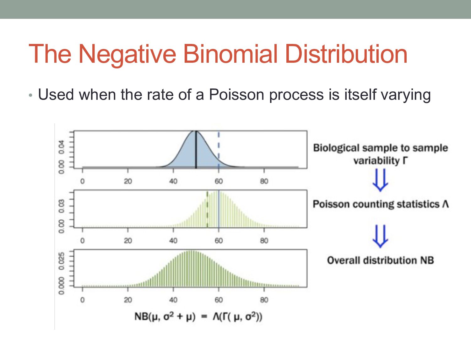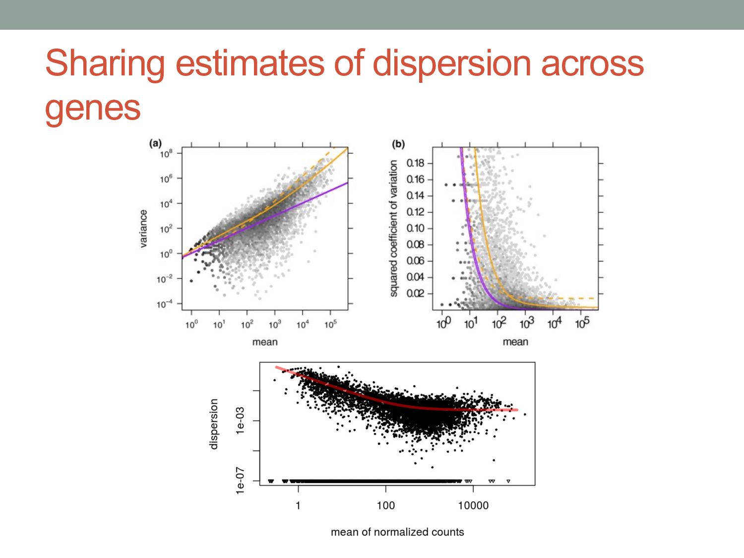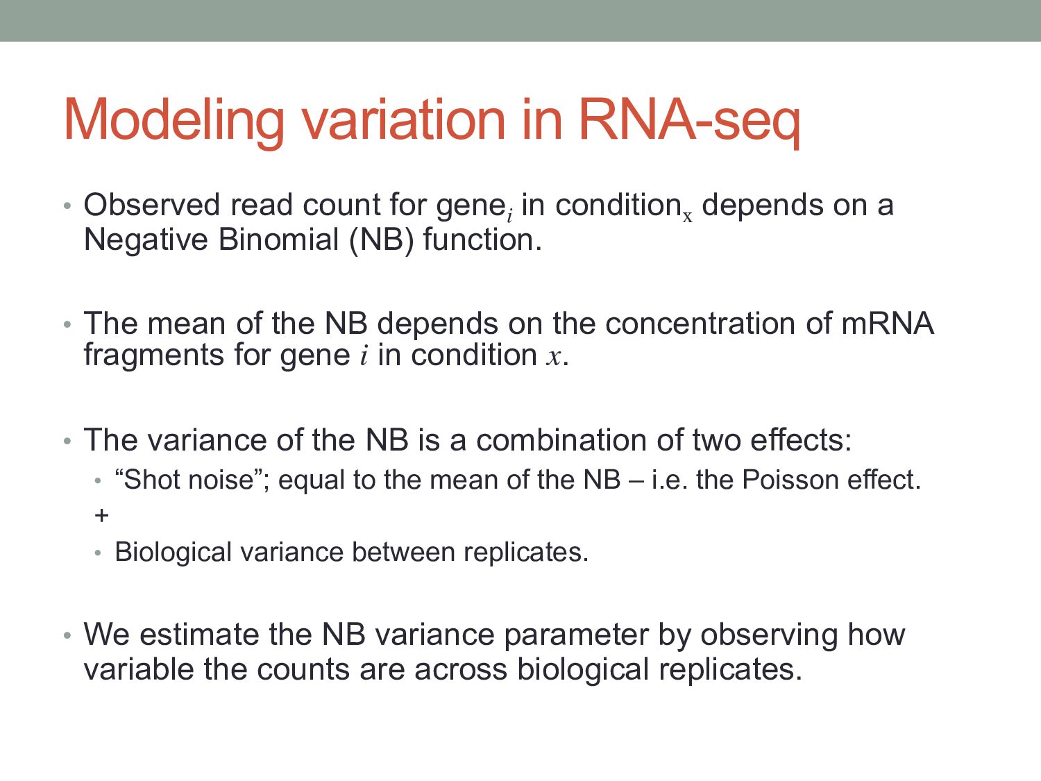 i in conditionx depends on a Negative Binomial (NB) function. • The mean of the NB depends on the concentration of mRNA fragments for gene i in condition x. • The variance of the NB is a combination of two effects: • “Shot noise”; equal to the mean of the NB – i.e. the Poisson effect. + • Biological variance between replicates. • We estimate the NB variance parameter by observing how variable the counts are across biological replicates.