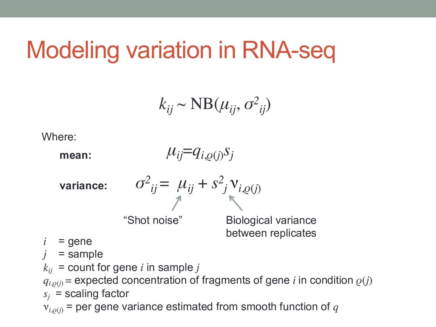 ) i = gene j = sample kij = count for gene i in sample j qi,ρ(j) = expected concentration of fragments of gene i in condition ρ(j) sj = scaling factor νi,ρ(j) = per gene variance estimated from smooth function of q Where: μij =qi,ρ(j) sj σ2 ij = μij + s2 j νi,ρ(j) “Shot noise” Biological variance between replicates mean: variance: