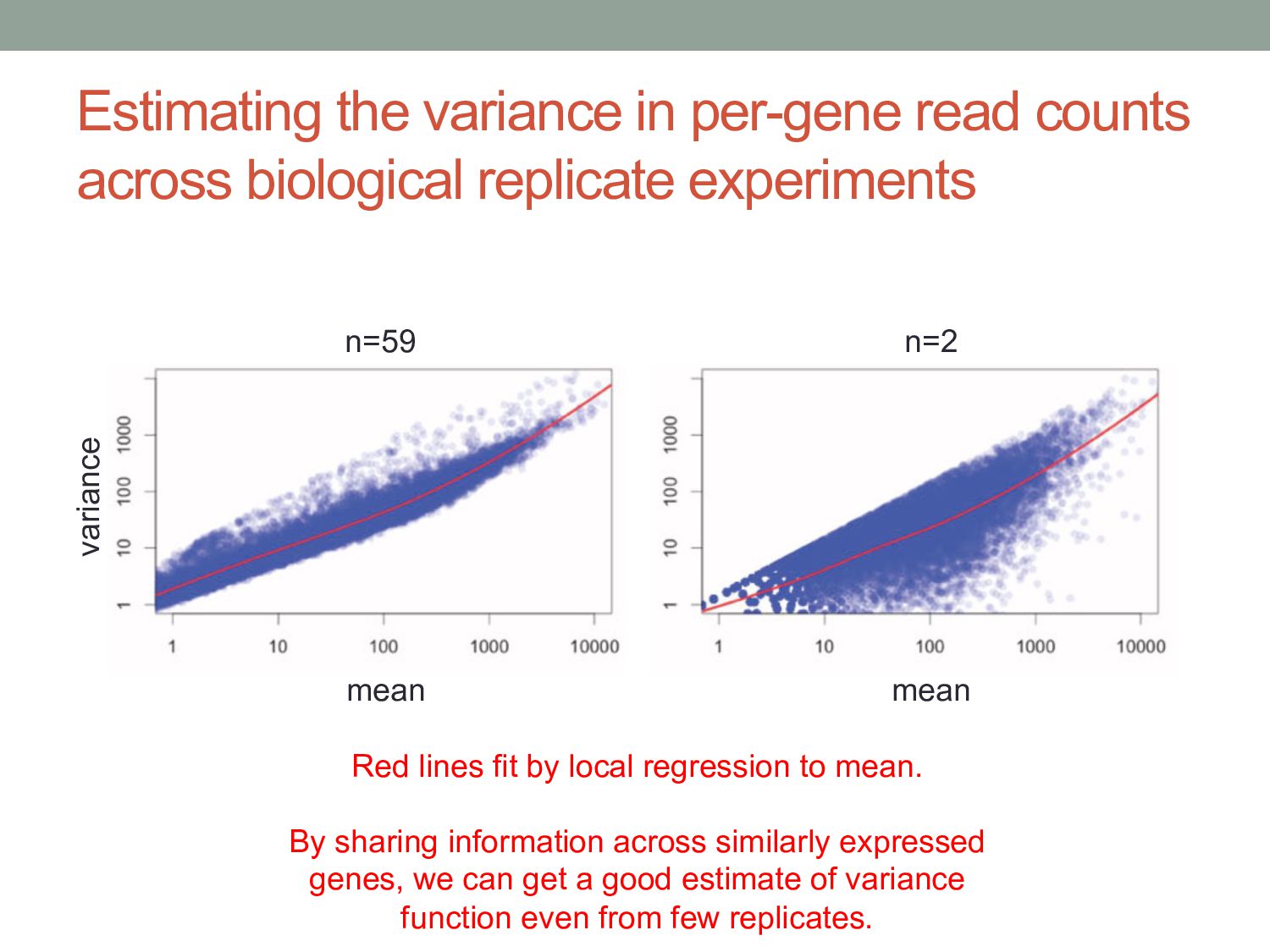 experiments n=59 n=2 mean mean variance Red lines fit by local regression to mean. By sharing information across similarly expressed genes, we can get a good estimate of variance function even from few replicates.
