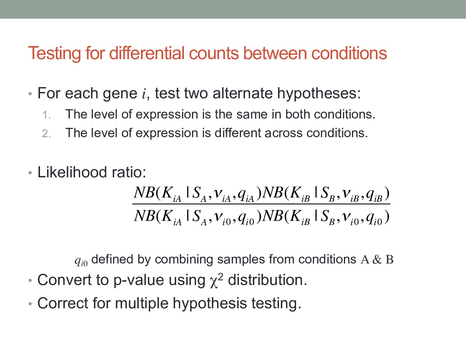 i, test two alternate hypotheses: 1. The level of expression is the same in both conditions. 2. The level of expression is different across conditions. • Likelihood ratio: qi0 defined by combining samples from conditions A & B • Convert to p-value using χ2 distribution. • Correct for multiple hypothesis testing. NB(K iA | S A ,νiA ,q iA )NB(K iB | S B ,νiB ,q iB ) NB(K iA | S A ,νi0 ,q i0 )NB(K iB | S B ,νi0 ,q i0 )
