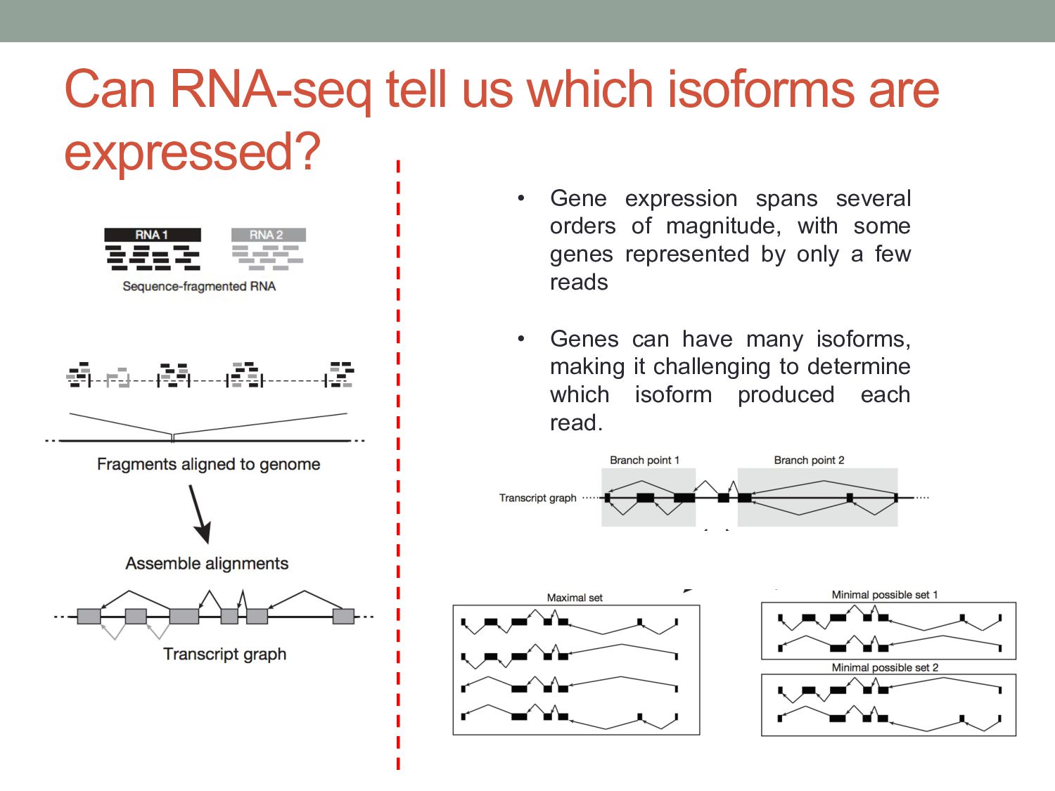 genes represented by only a few reads • Genes can have many isoforms, making it challenging to determine which isoform produced each read. Can RNA-seq tell us which isoforms are expressed?