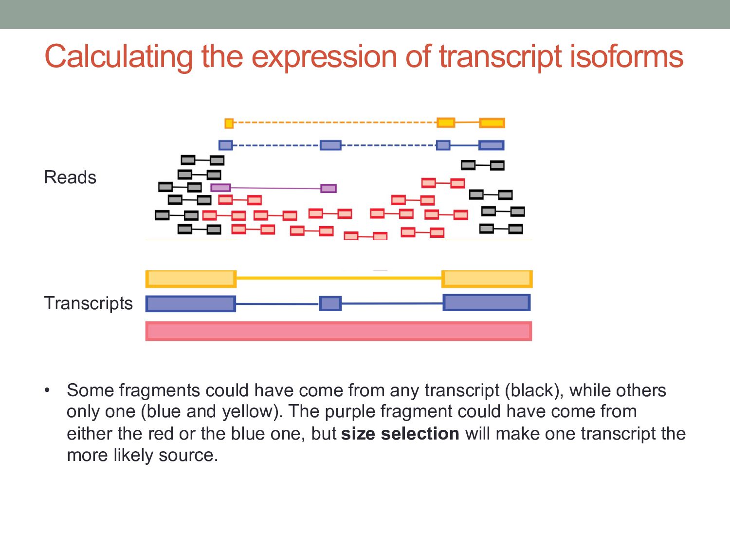 have come from any transcript (black), while others only one (blue and yellow). The purple fragment could have come from either the red or the blue one, but size selection will make one transcript the more likely source. Reads Transcripts