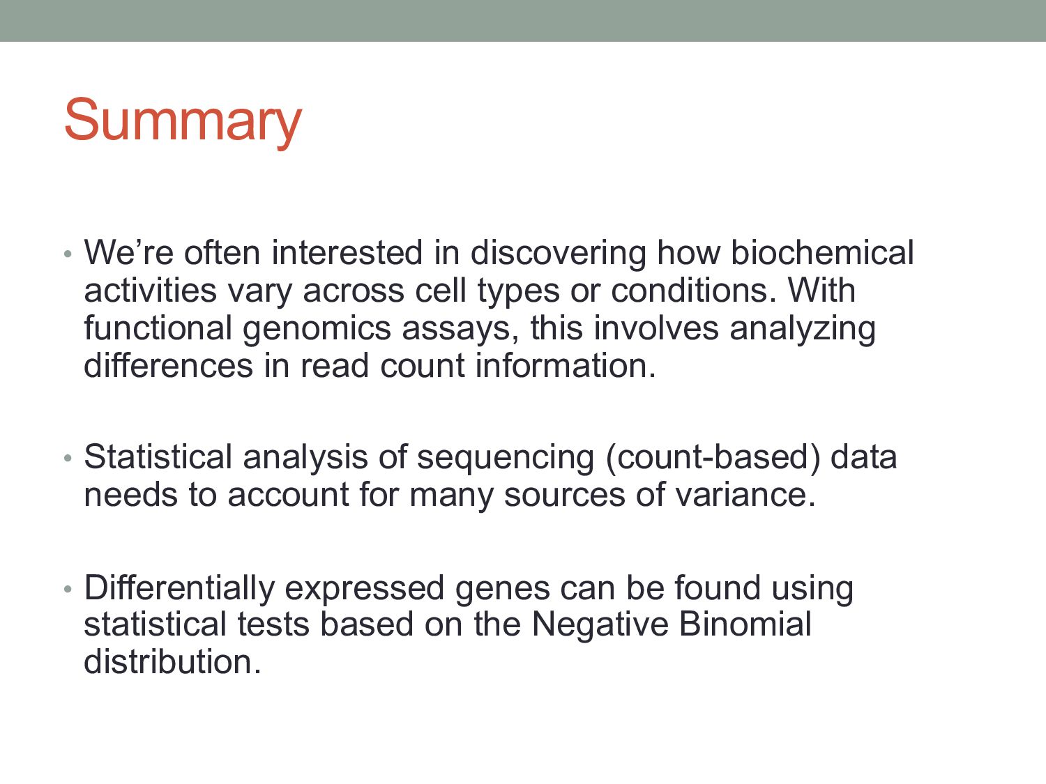 vary across cell types or conditions. With functional genomics assays, this involves analyzing differences in read count information. • Statistical analysis of sequencing (count-based) data needs to account for many sources of variance. • Differentially expressed genes can be found using statistical tests based on the Negative Binomial distribution.