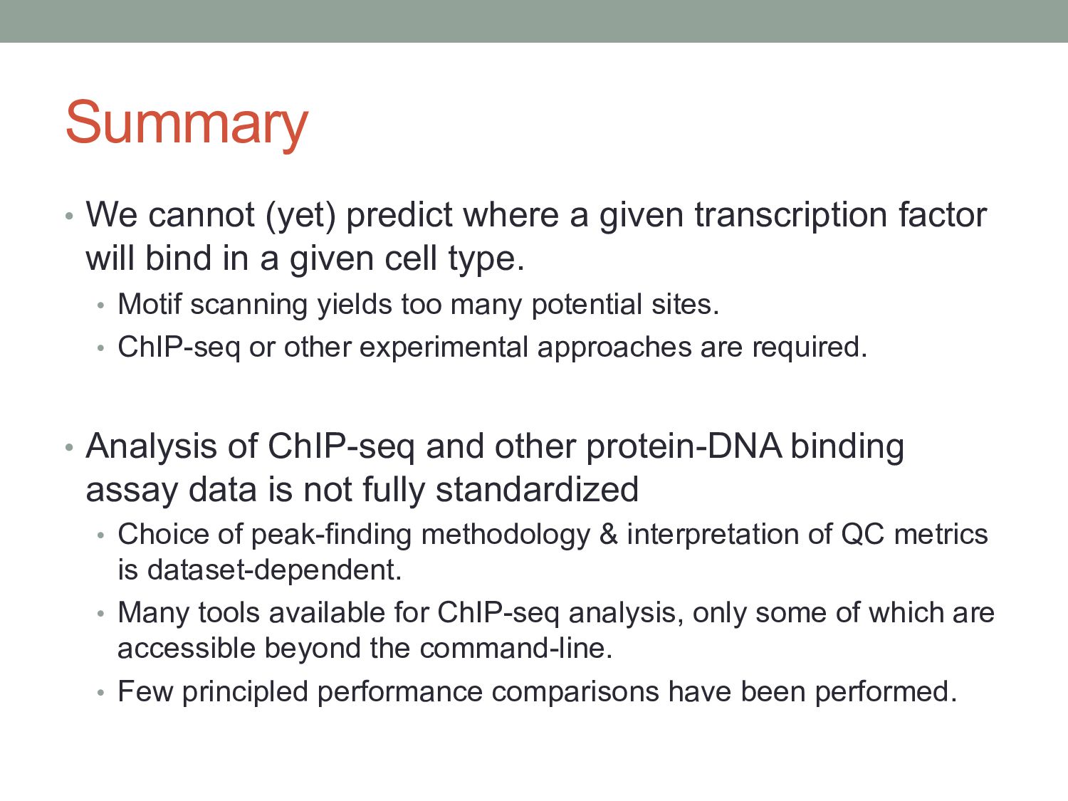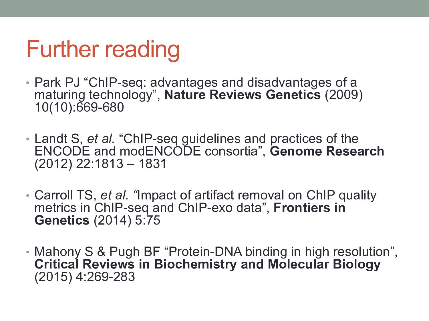 a maturing technology”, Nature Reviews Genetics (2009) 10(10):669-680 • Landt S, et al. “ChIP-seq guidelines and practices of the ENCODE and modENCODE consortia”, Genome Research (2012) 22:1813 – 1831 • Carroll TS, et al. “Impact of artifact removal on ChIP quality metrics in ChIP-seq and ChIP-exo data”, Frontiers in Genetics (2014) 5:75 • Mahony S & Pugh BF “Protein-DNA binding in high resolution”, Critical Reviews in Biochemistry and Molecular Biology (2015) 4:269-283