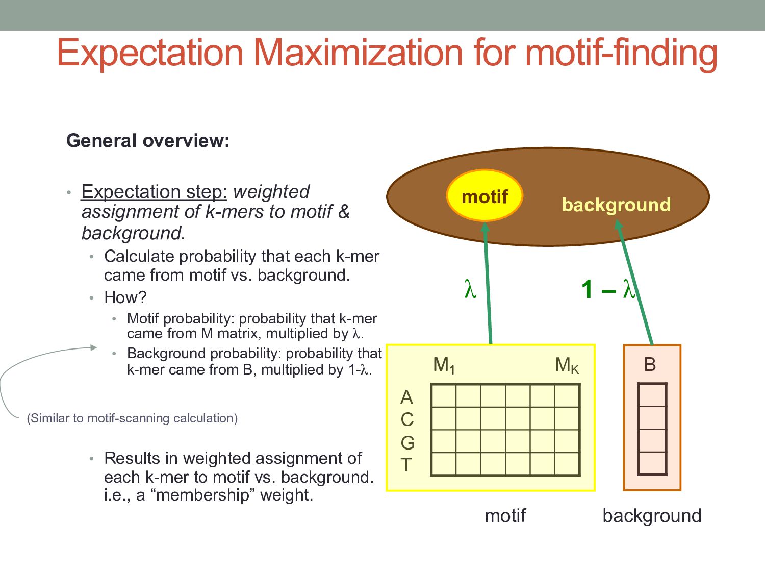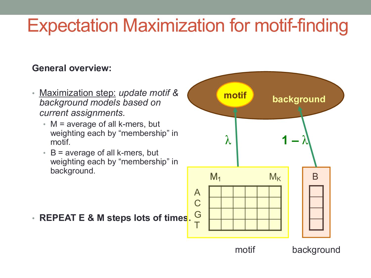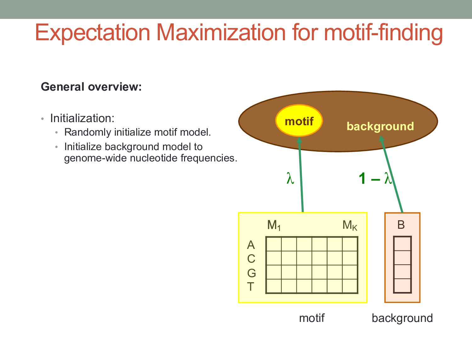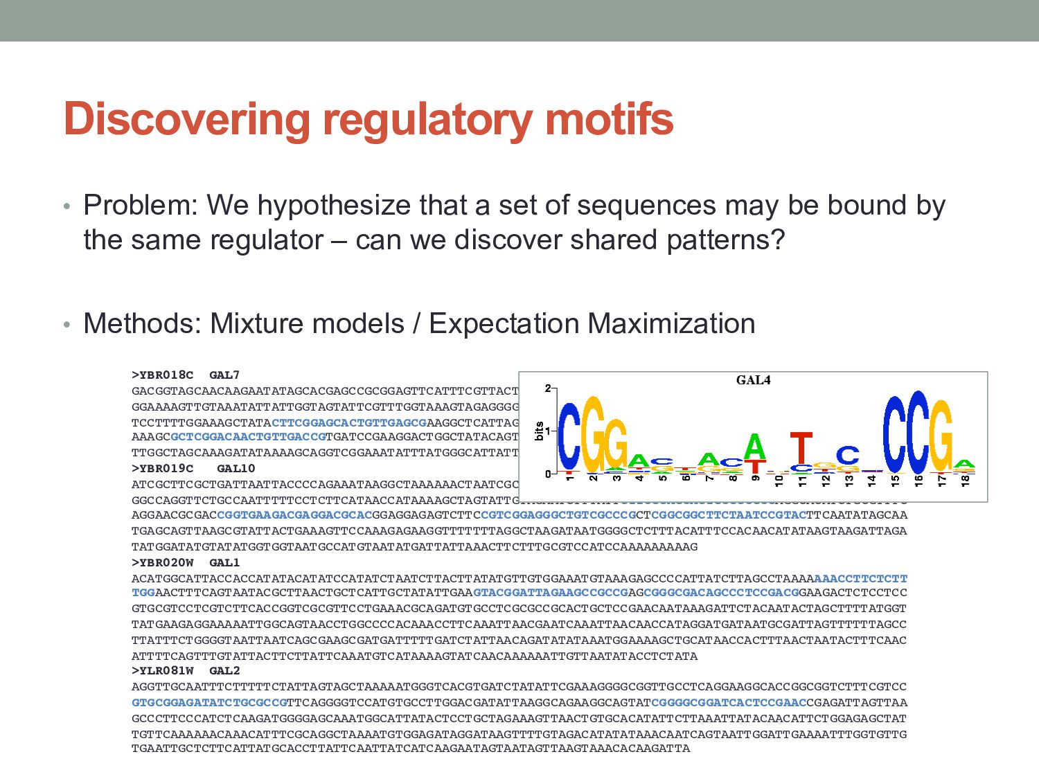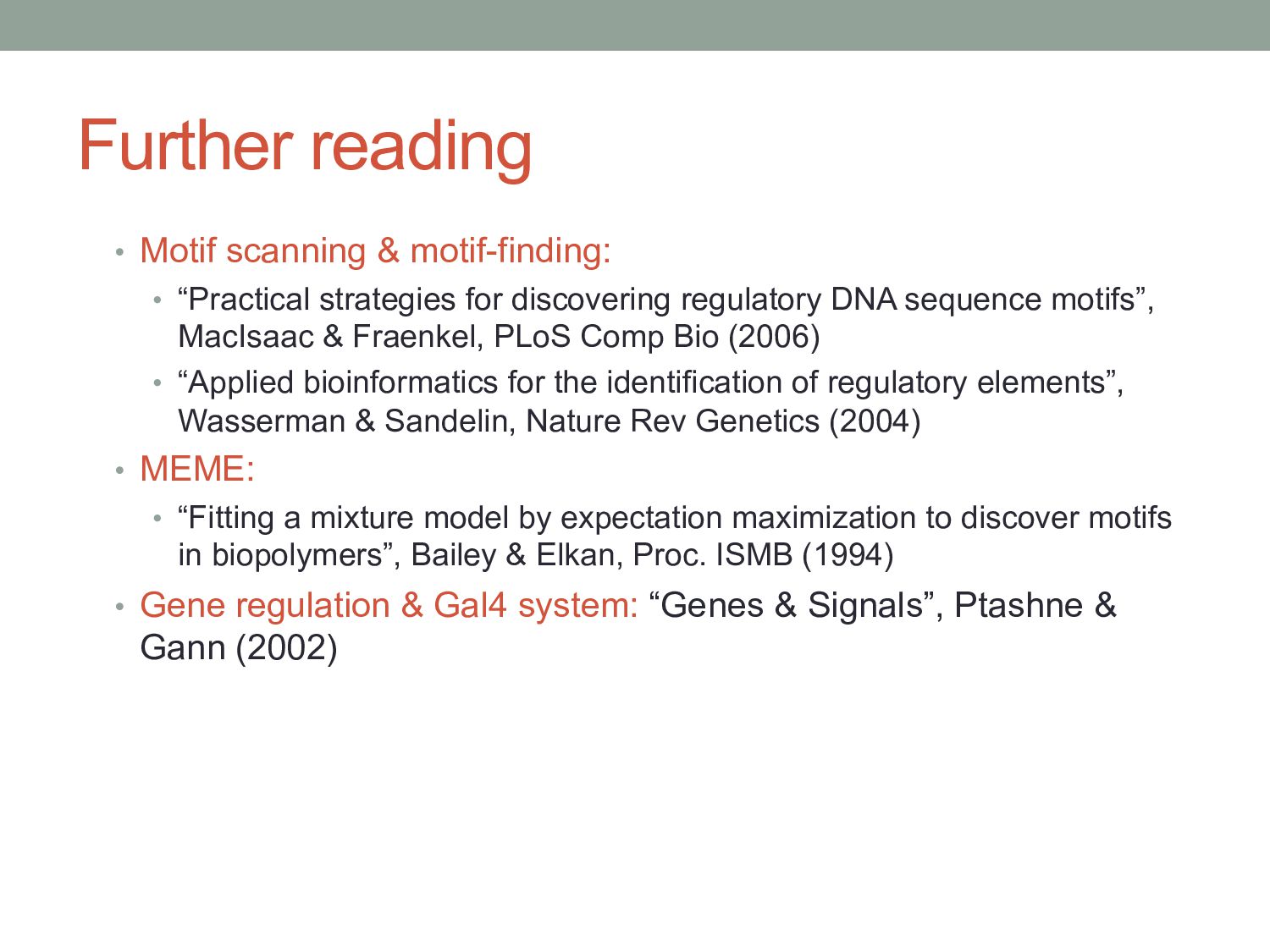 for discovering regulatory DNA sequence motifs”, MacIsaac & Fraenkel, PLoS Comp Bio (2006) • “Applied bioinformatics for the identification of regulatory elements”, Wasserman & Sandelin, Nature Rev Genetics (2004) • MEME: • “Fitting a mixture model by expectation maximization to discover motifs in biopolymers”, Bailey & Elkan, Proc. ISMB (1994) • Gene regulation & Gal4 system: “Genes & Signals”, Ptashne & Gann (2002)
