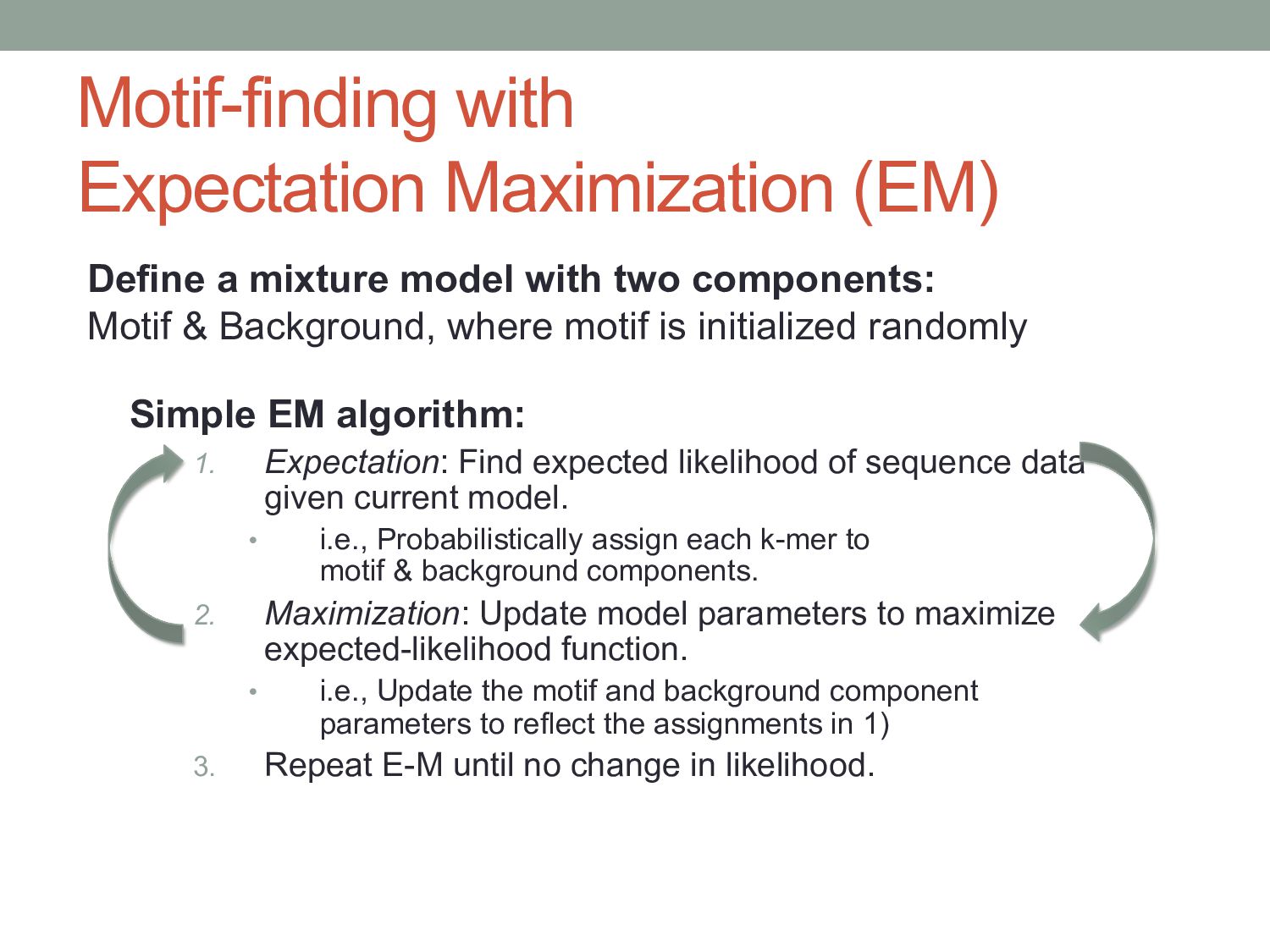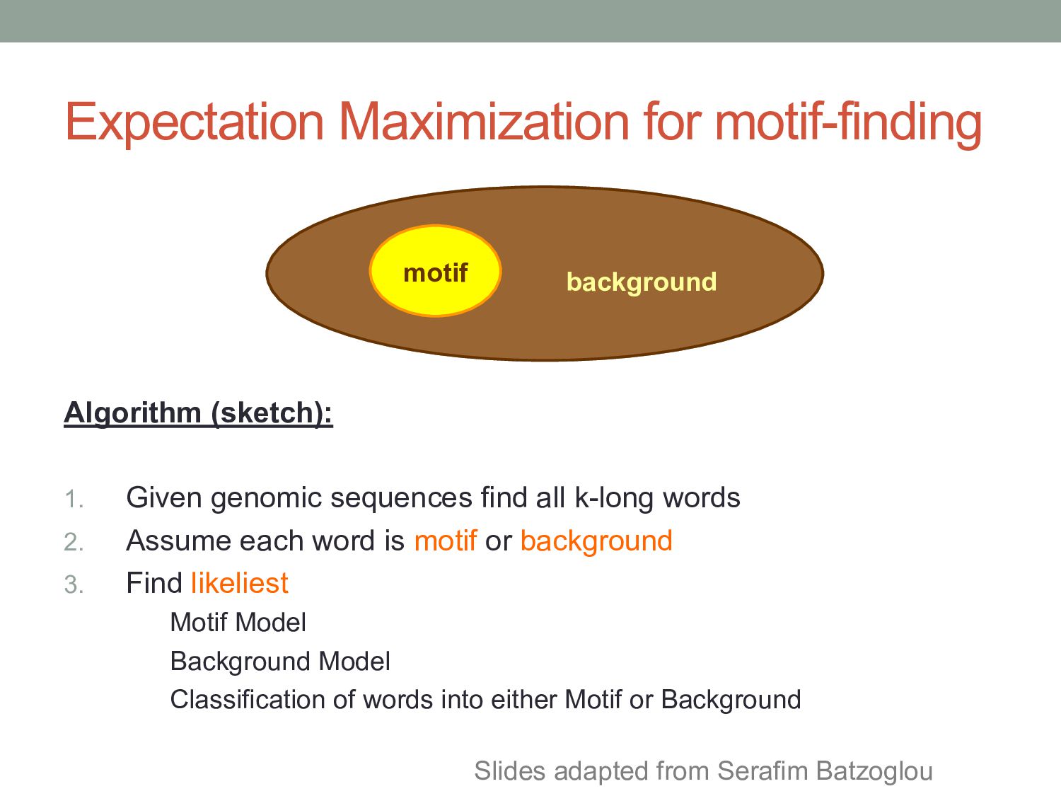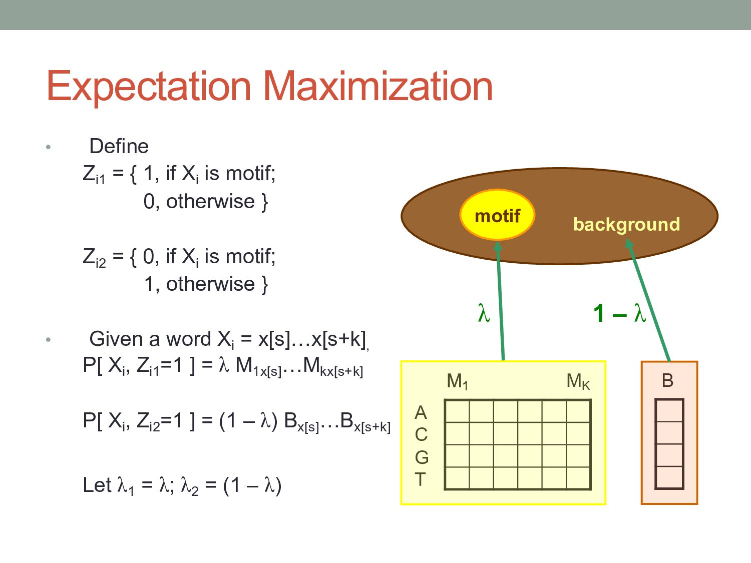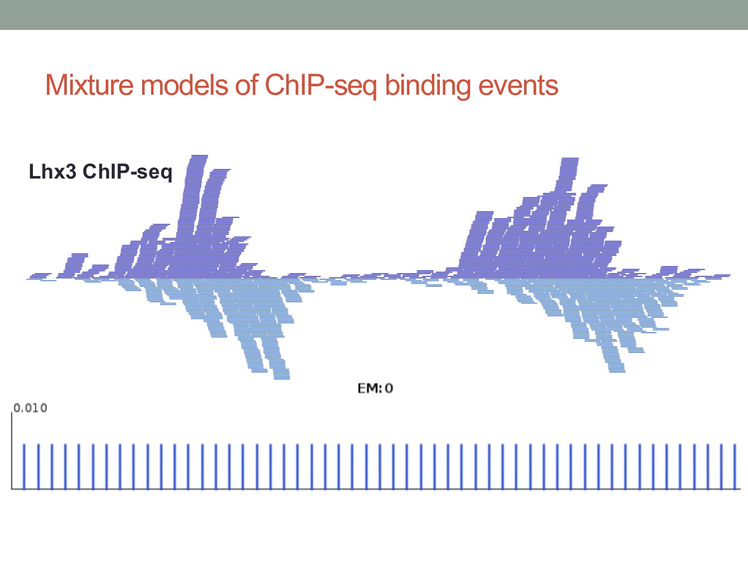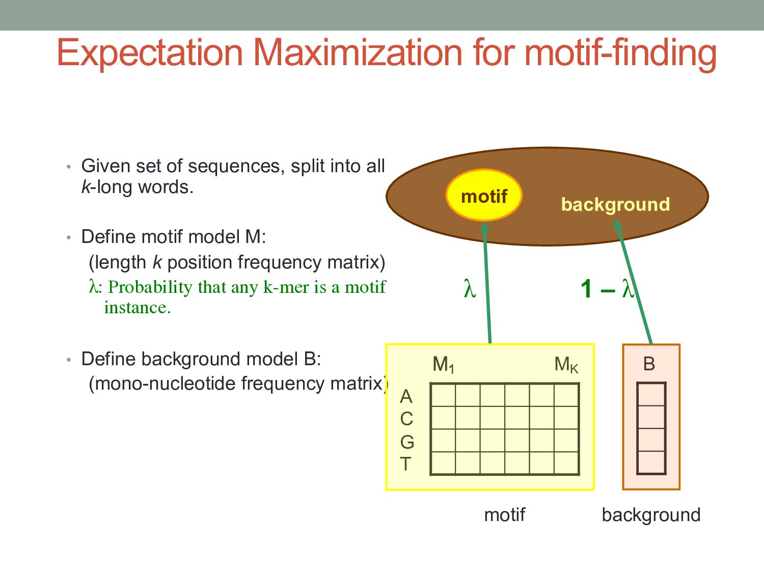 for discovering regulatory DNA sequence motifs”, MacIsaac & Fraenkel, PLoS Comp Bio (2006) • “Applied bioinformatics for the identification of regulatory elements”, Wasserman & Sandelin, Nature Rev Genetics (2004) • MEME: • “Fitting a mixture model by expectation maximization to discover motifs in biopolymers”, Bailey & Elkan, Proc. ISMB (1994) • Gene regulation & Gal4 system: “Genes & Signals”, Ptashne & Gann (2002)