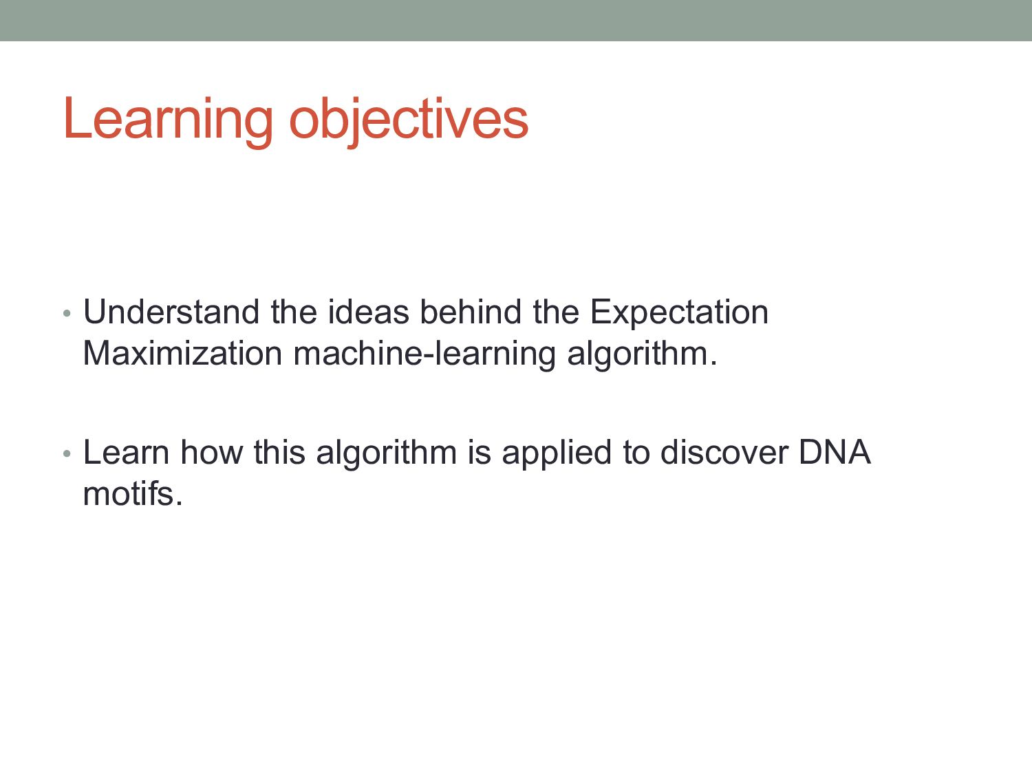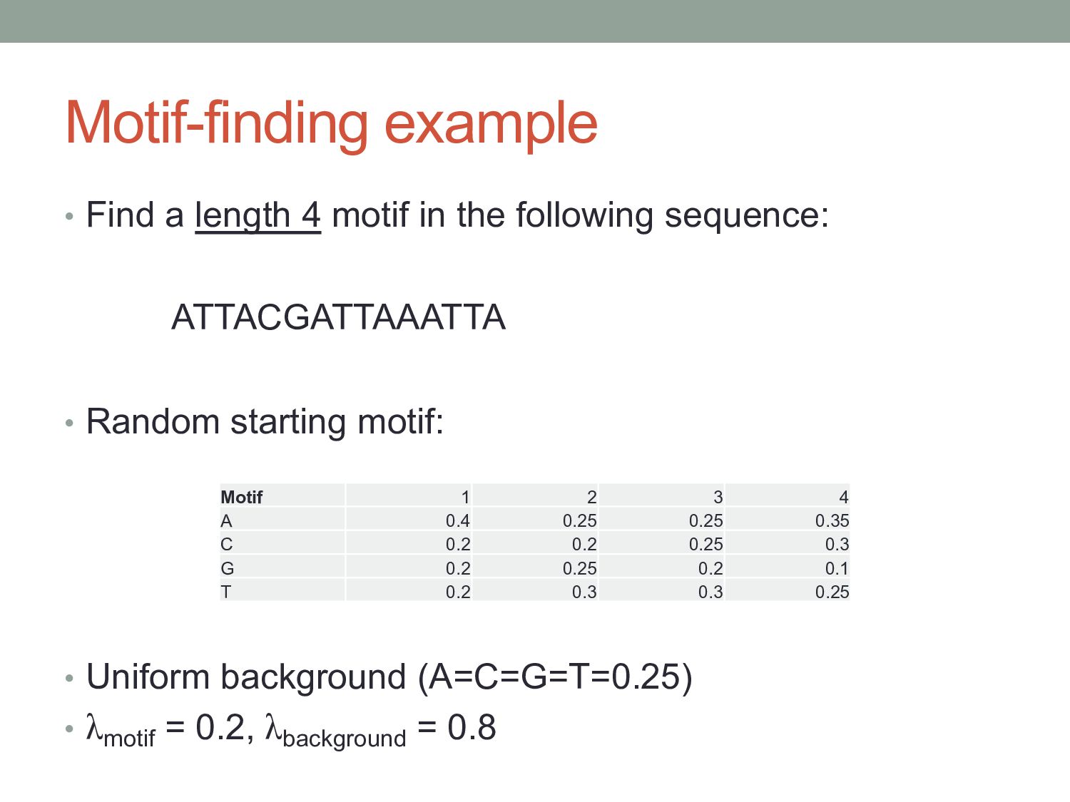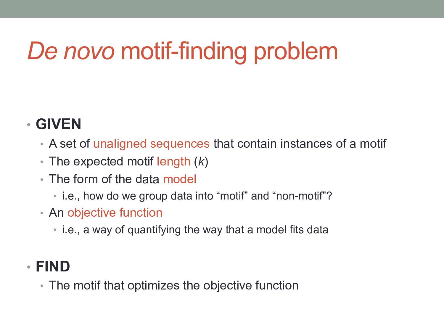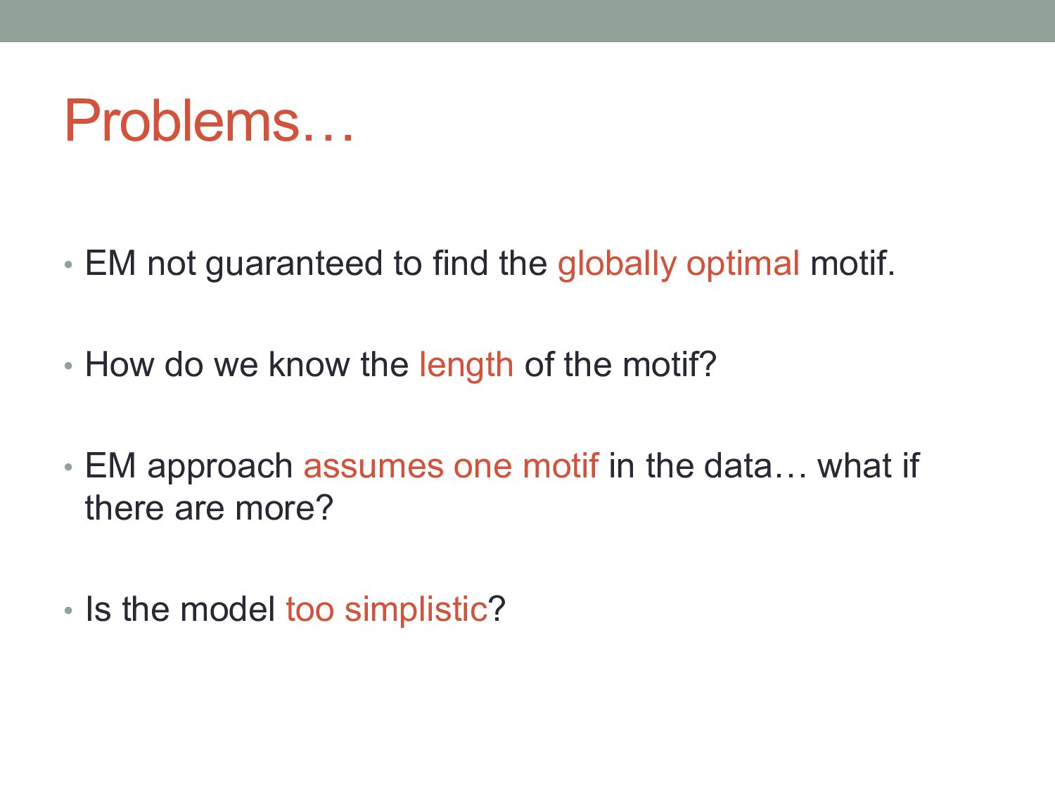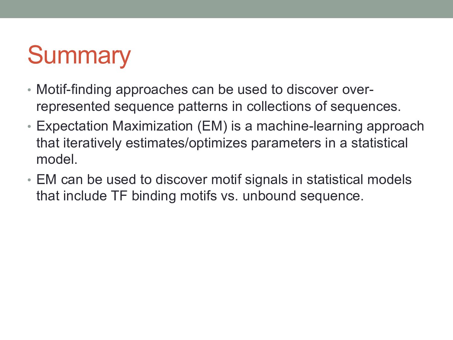 for discovering regulatory DNA sequence motifs”, MacIsaac & Fraenkel, PLoS Comp Bio (2006) • “Applied bioinformatics for the identification of regulatory elements”, Wasserman & Sandelin, Nature Rev Genetics (2004) • MEME: • “Fitting a mixture model by expectation maximization to discover motifs in biopolymers”, Bailey & Elkan, Proc. ISMB (1994) • Gene regulation & Gal4 system: “Genes & Signals”, Ptashne & Gann (2002)