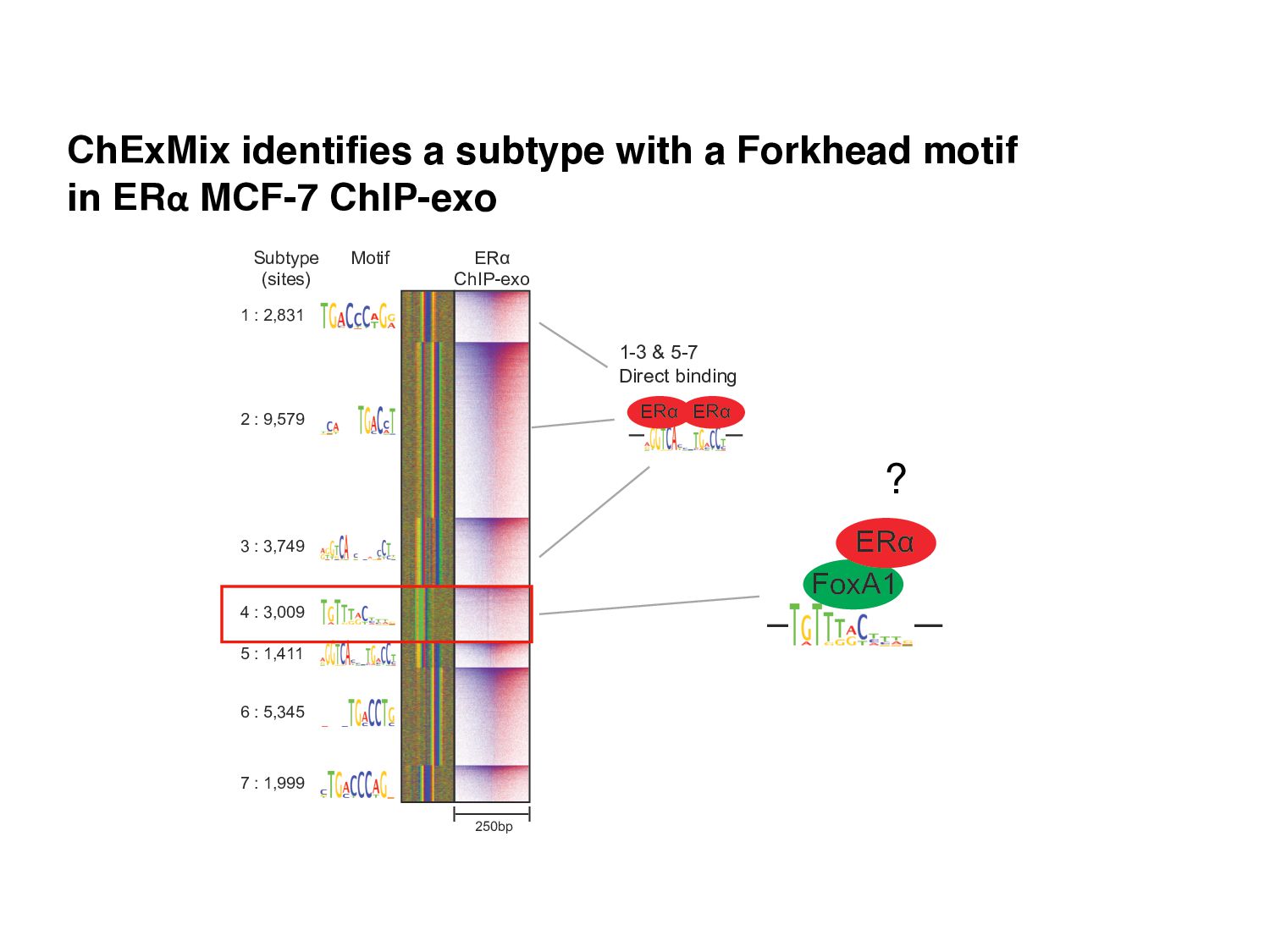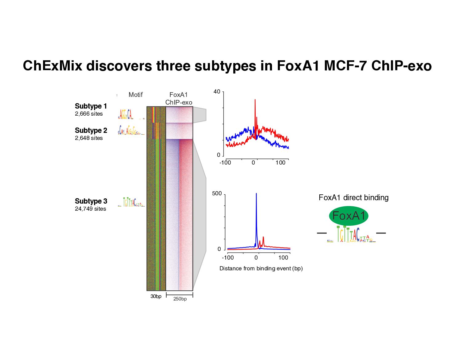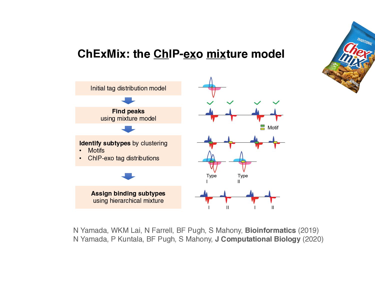 Initial tag distribution model Find peaks using mixture model Type II Type I Assign binding subtypes using hierarchical mixture II I II I ChExMix: the ChIP-exo mixture model N Yamada, WKM Lai, N Farrell, BF Pugh, S Mahony, Bioinformatics (2019) N Yamada, P Kuntala, BF Pugh, S Mahony, J Computational Biology (2020)