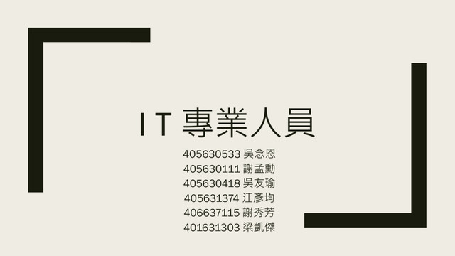 I T 專業人員 405630533 吳念恩 405630111 謝孟勳 405630418 吳友瑜 405631374