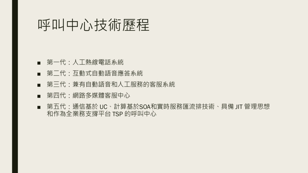 呼叫中心技術歷程 ▪ 第一代:人工熱線電話系統 ▪ 第二代:互動式自動語音應答系統 ▪ 第三代:兼有自動語音和人工服務的客服系統 ▪ 第四代:網路多媒體客服中心 ▪