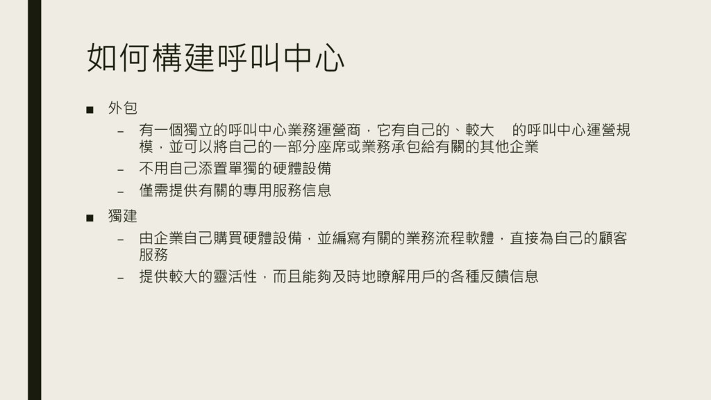 如何構建呼叫中心 ▪ 外包 – 有一個獨立的呼叫中心業務運營商,它有自己的、較大 的呼叫中心運營規 模,並可以將自己的一部分座席或業務承包給有關的其他企業 – 不用自己添置單獨的硬體設備 –