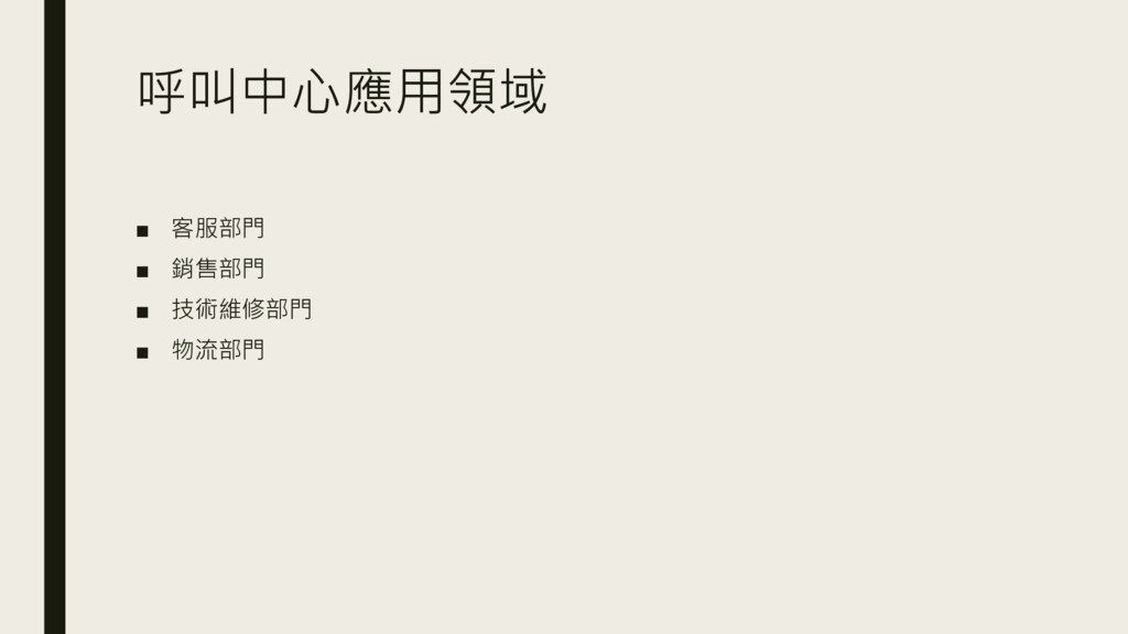 呼叫中心應用領域 ▪ 客服部門 ▪ 銷售部門 ▪ 技術維修部門 ▪ 物流部門