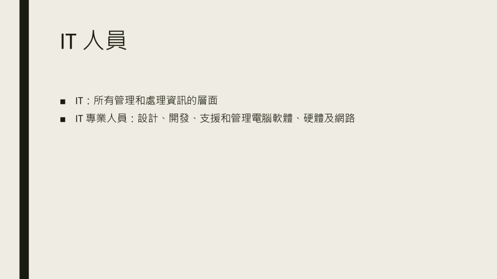 IT 人員 ▪ IT:所有管理和處理資訊的層面 ▪ IT 專業人員:設計、開發、支援和管理電腦軟體、硬體及網路