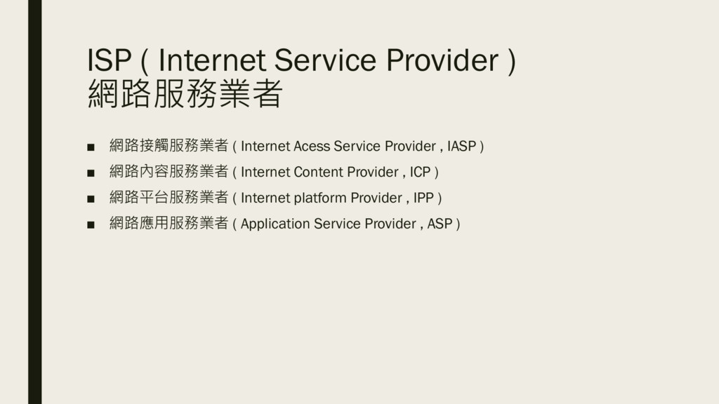 Internet Acess Service Provider , IASP ) ▪ 網路內容服務業者 ( Internet Content Provider , ICP ) ▪ 網路平台服務業者 ( Internet platform Provider , IPP ) ▪ 網路應用服務業者 ( Application Service Provider , ASP )